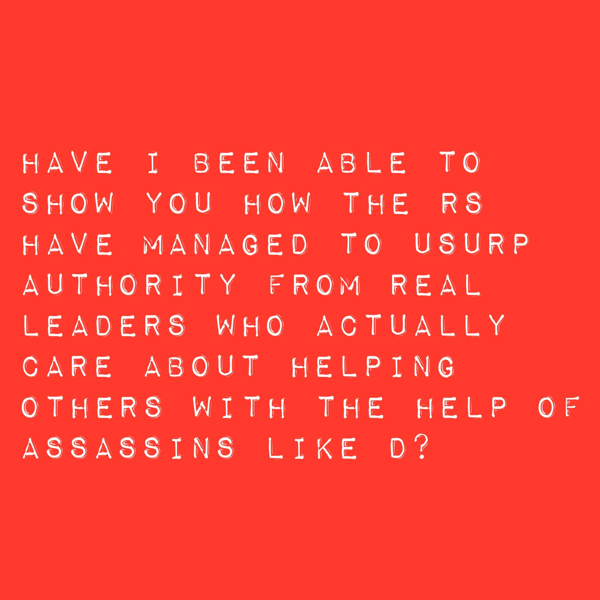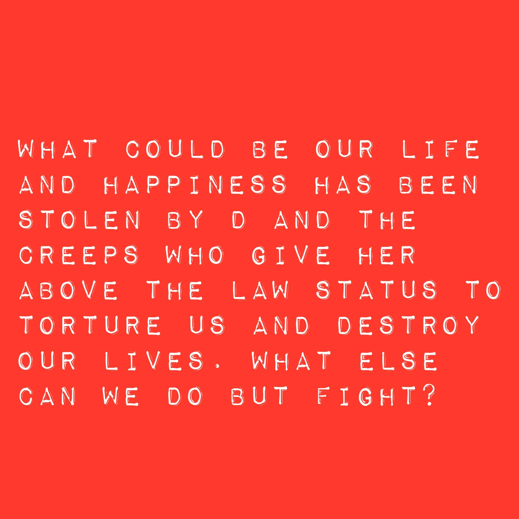 Secret society operators like D are trapping us, separating us, child trafficking us into worst predicaments and they are deliberately torturing us on top of it. All this limitless power because the Rs hijacked the financial system and then they empower the morally insane to prey on us. D or someone like her habitually gets away with murdering the innocent until someone learns how to stop them.