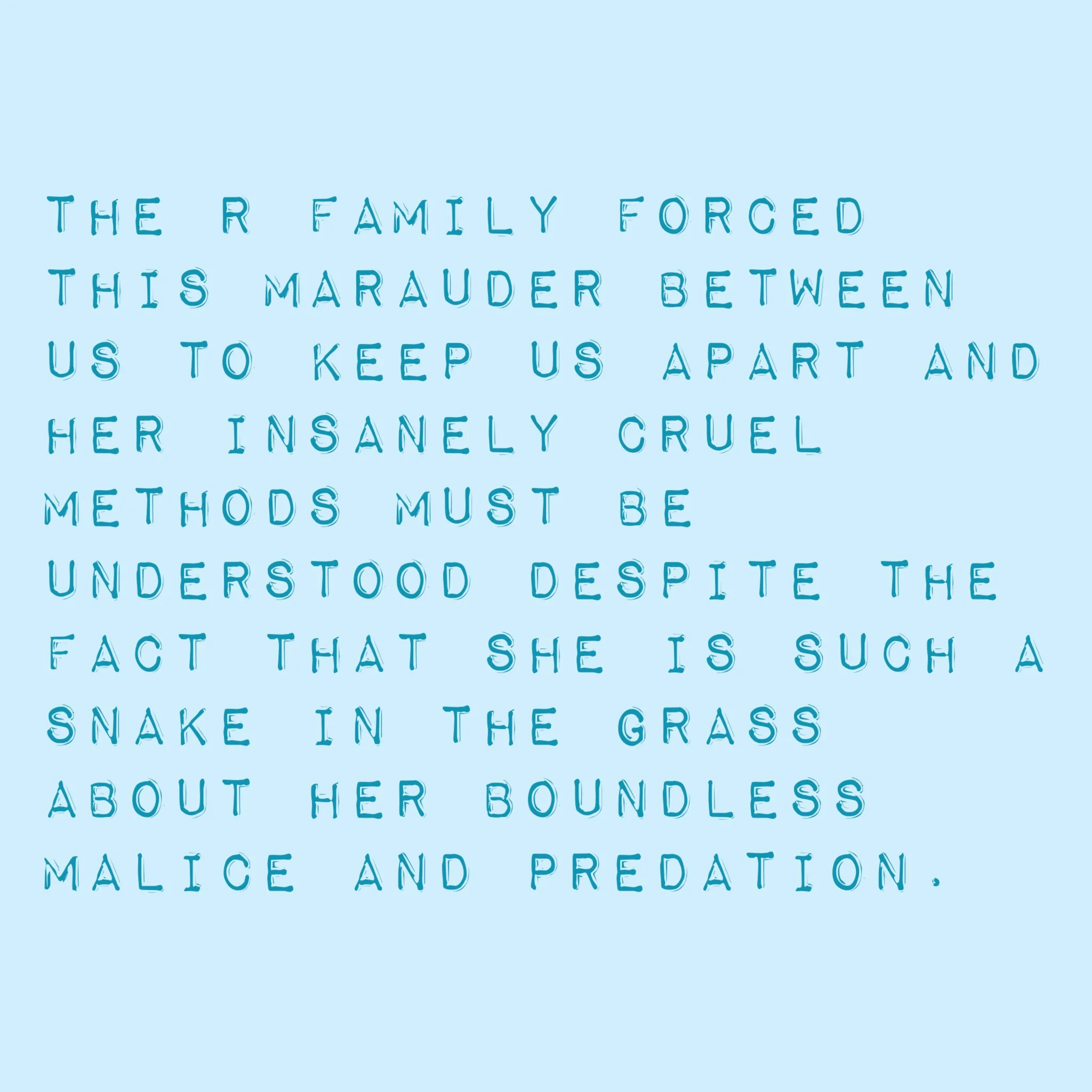 How could I have possibly imagined that a diabolical family controlling almost everything was doing this to me on purpose and that all of these abusers who flocked to me were in their employ? I wanted to be good whatever that was and I wanted to have integrity and all of these obstacles were created to corrupt me! I’m still not doing what I want because I have to constantly fight to get free from this horrible global menace.