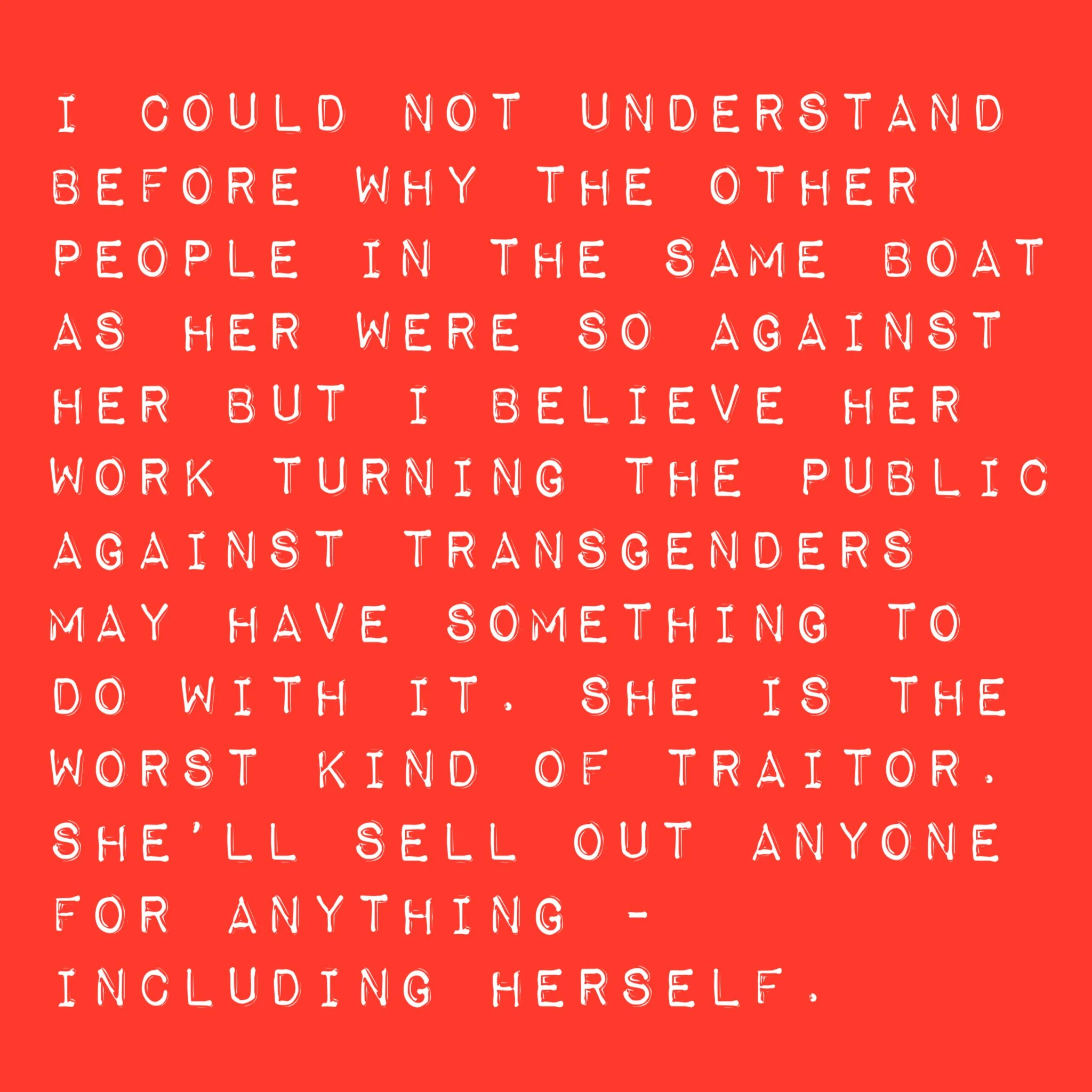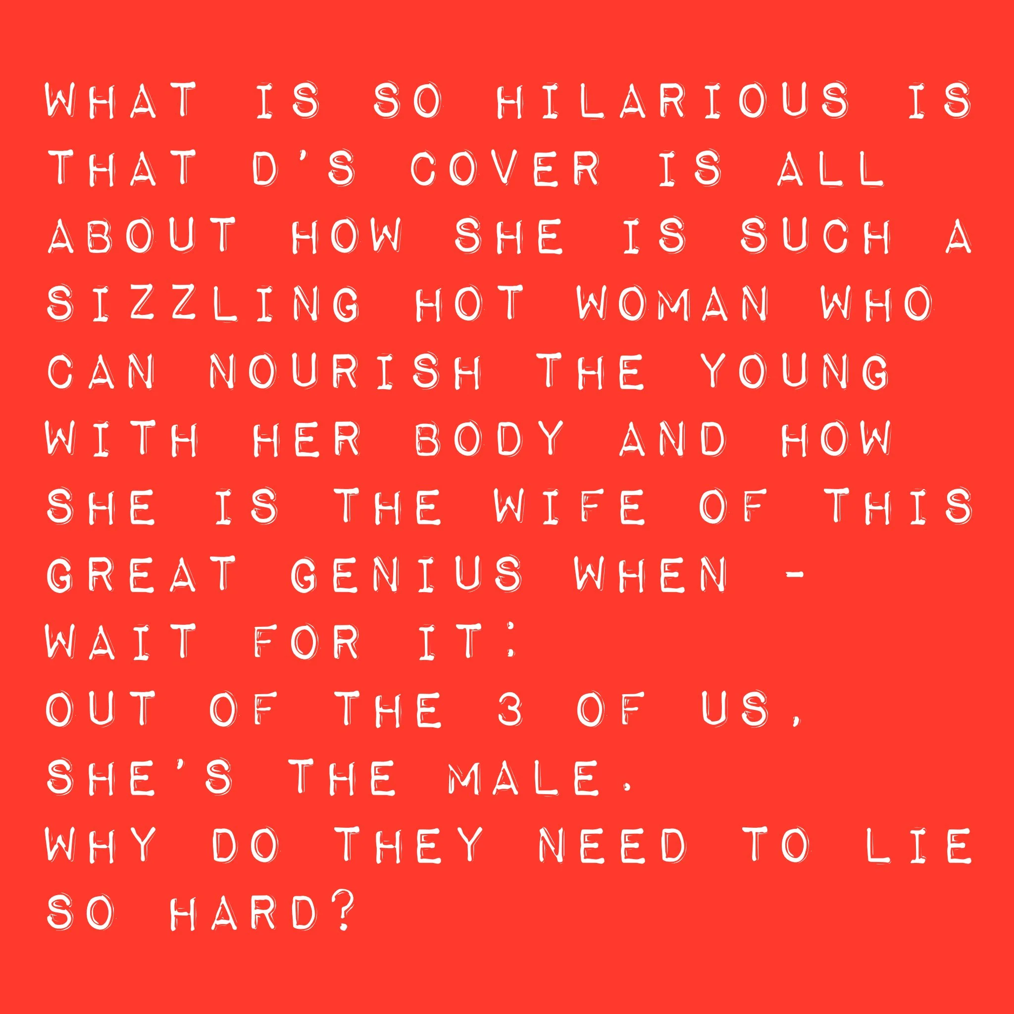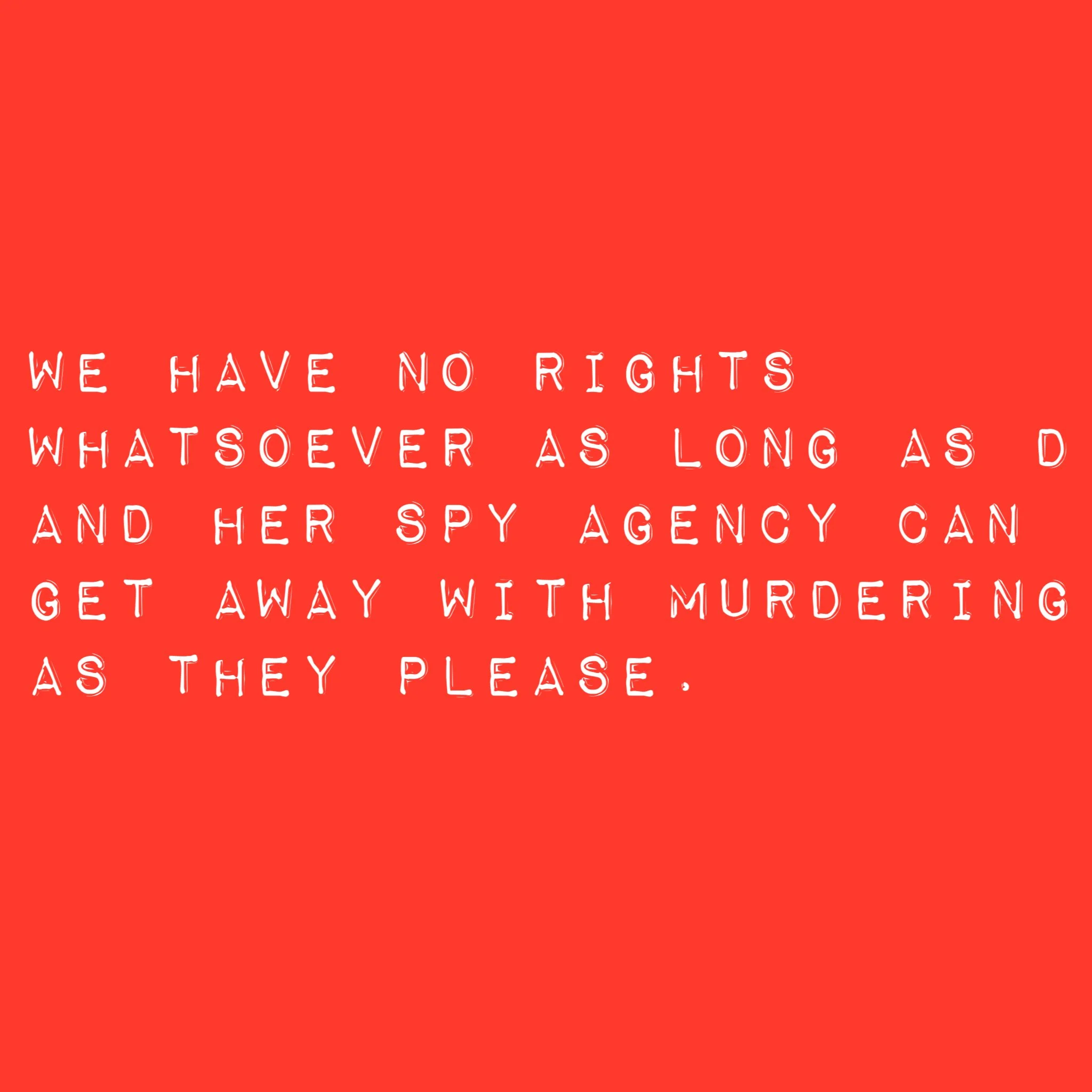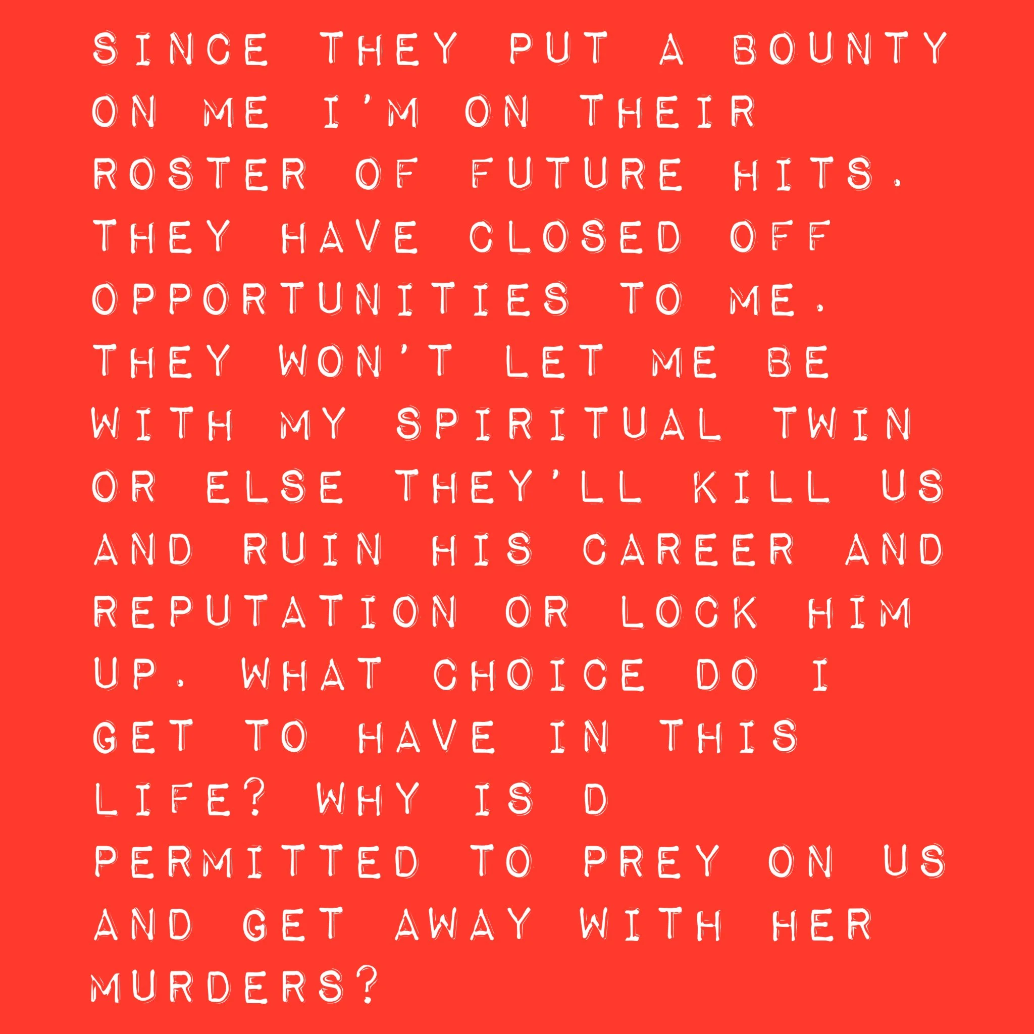 D can go around killing people and we cannot remove her from our lives and we cannot move on because we’ve all been captured by her masters, the R family. It seems very wrong that we are not permitted the freedom to live because D and her masters like to keep all the freedom to themselves so they can steal and murder.