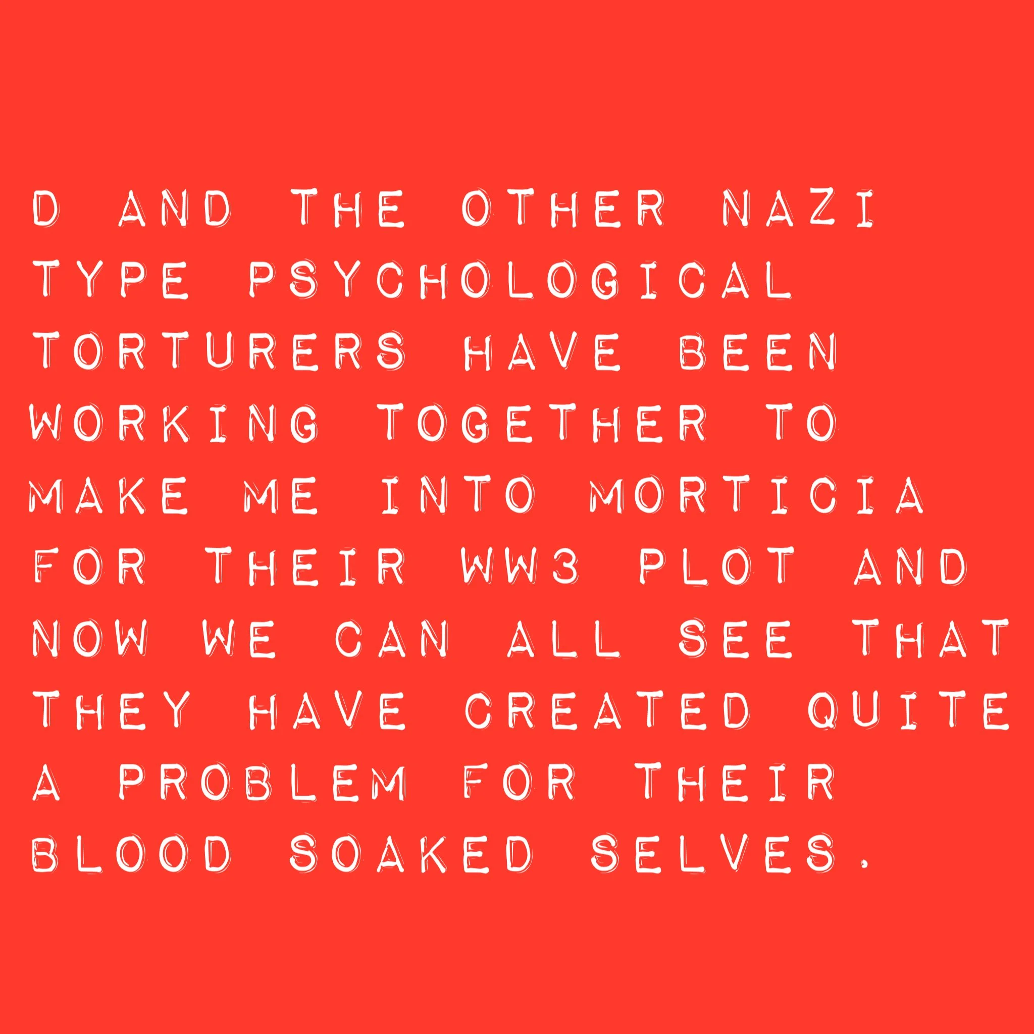 “Everyone is watching D being a Nazi torturer TO YOU as she pretends to ignore you using me as her slave/puppet. She saw this coming since Look Now and she was certain she could handle it. Everyone can judge her intelligence as one pleases.”