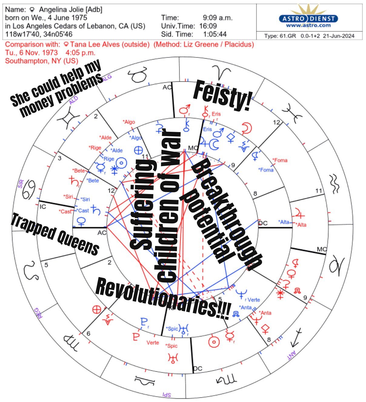 Please observe some notes below about the clear picture that emerges from a quick look at Angelina Jolie’s natal chart.