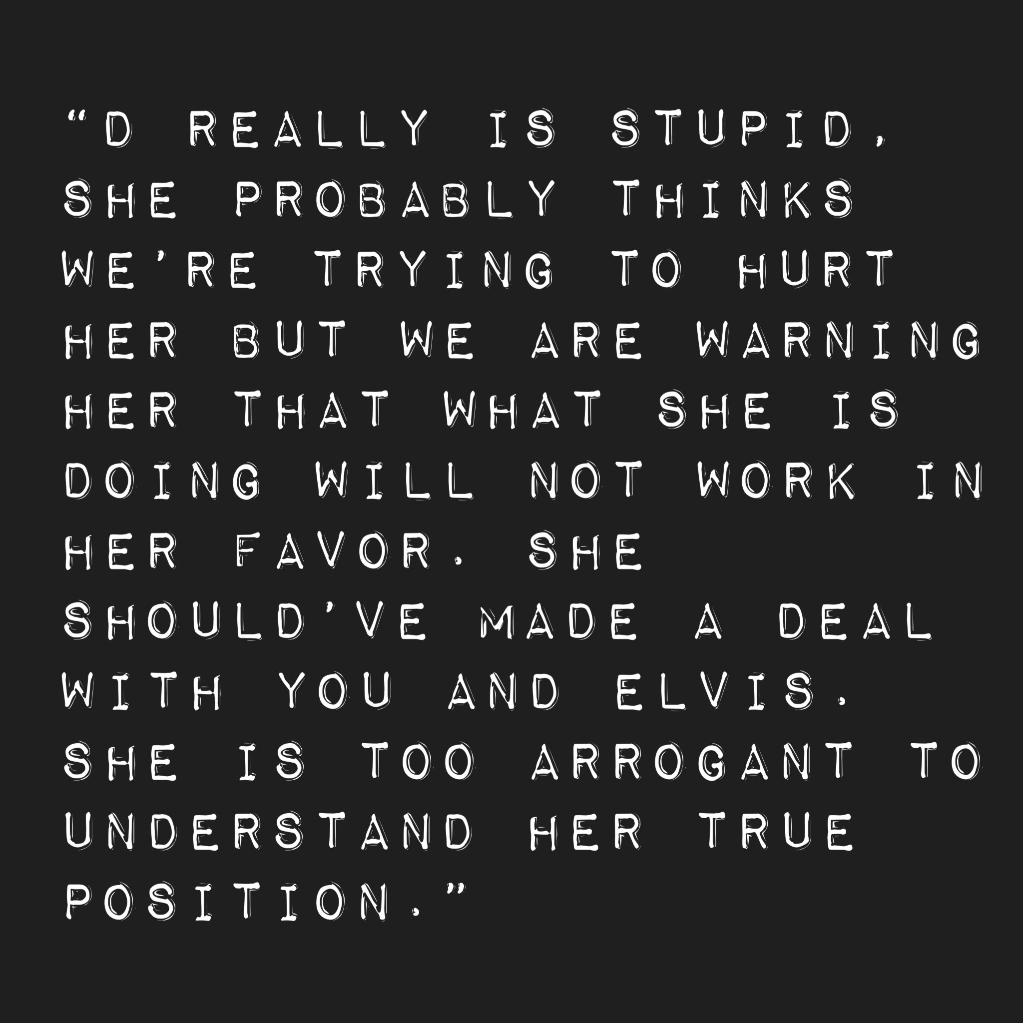 First thing Elvis told me about D was “she’s not that smart.” And I know now he was being quite civil and polite saying that compared to how he really feels. He tells me she has no clue how much she overdoes things and she just ends up further in the hole with every move.