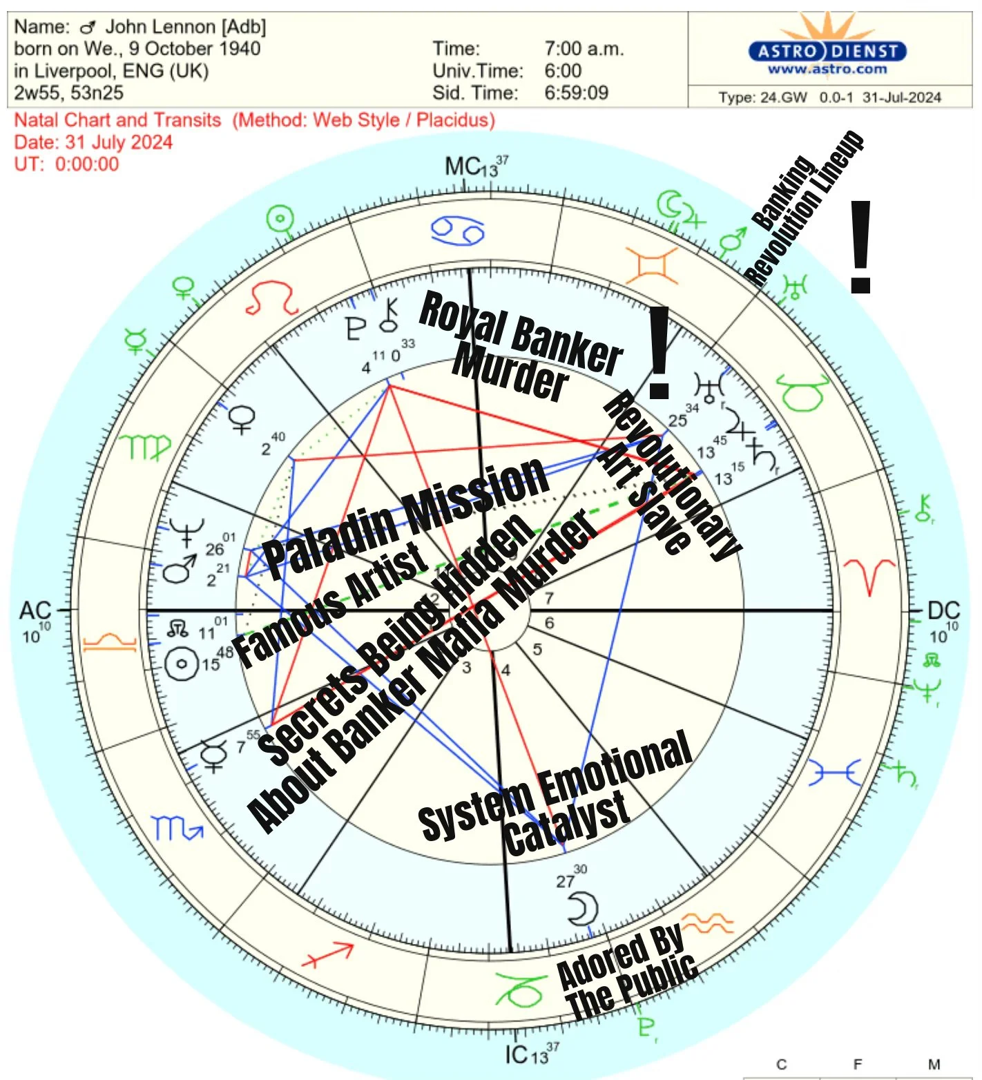 It’s interesting that I was asked to do John’s chart today as he has his natal Uranus (Genius/Revolution) in alignment with transiting Uranus. This is the perfect time to focus on banking revolution and on John’s important work to see us into REAL CHANGE.