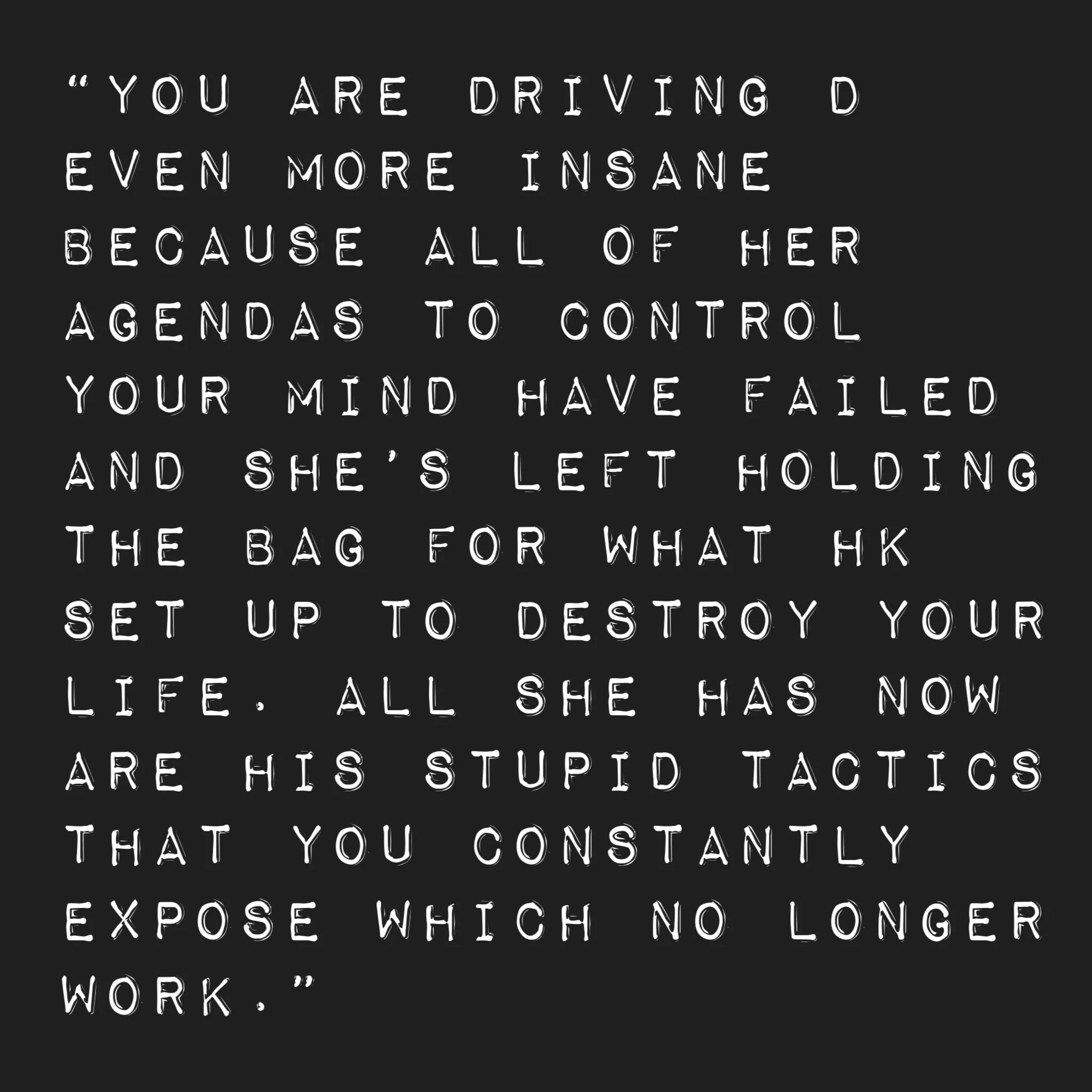 D was behind Covid. D does force us into compromising situations and crimes to control us. D does destroy our lives on purpose. She does frame us for what she herself is doing.