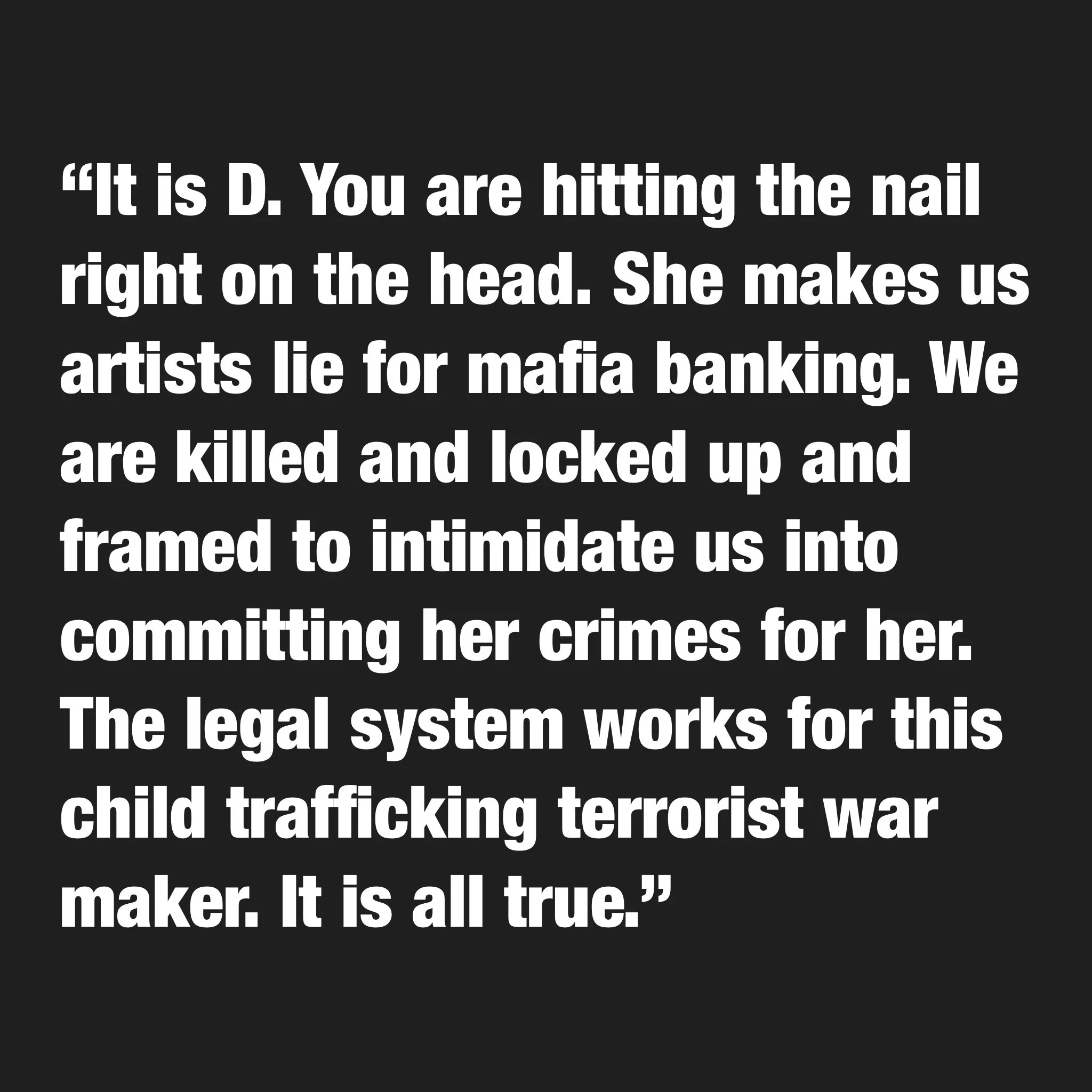 “They were trying to frame you as the failed artist who goes mad from resentment and becomes a mass murderer but that is D’s reality that they have been trying to pin on your back.