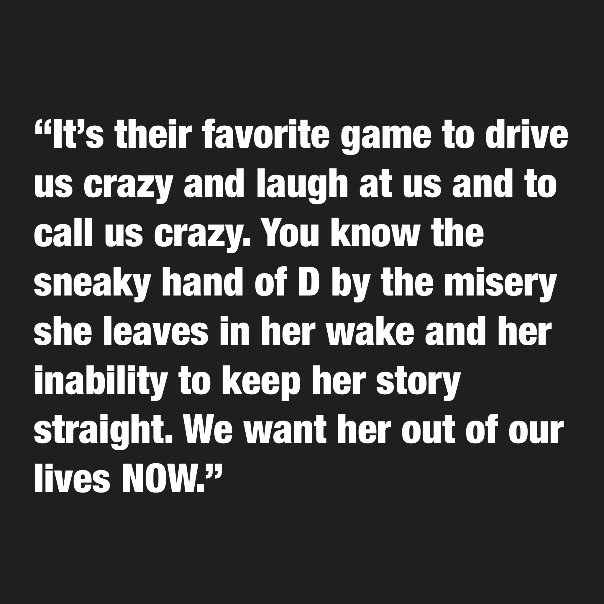 “D is the failed artist going mad from resentment because she is nothing but a despised hack whom we all wish would disappear now.”