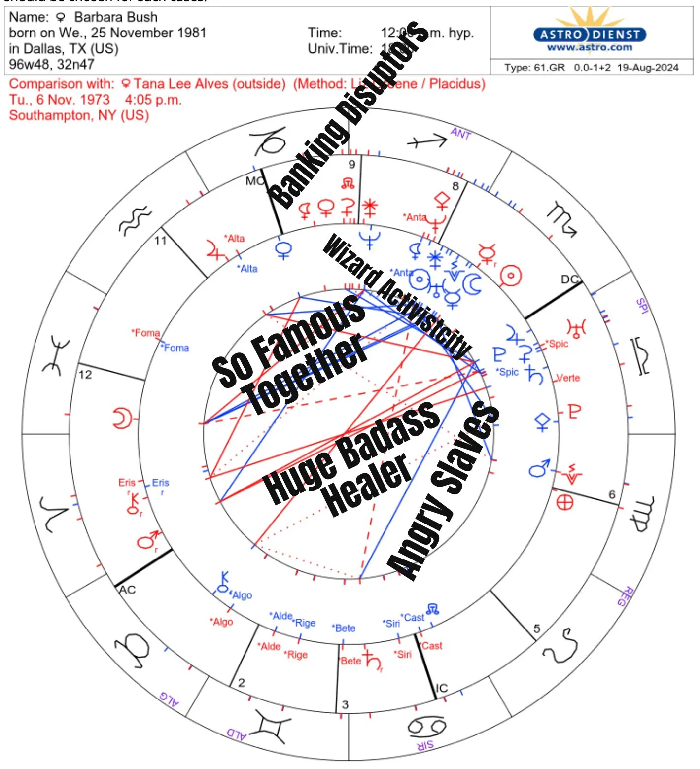 Jenna and Barbara have immense superpowers. Their natal chart shows a particular focus on banking. They are both extremely concerned about the future. We are living under the reign of luciferians who love to torment and murder us and because they completely own banking and have it all to themselves me, Jenna and Barbara constantly live in fear of being assassinated. There is no justice system to call. There is nothing we can all do but unite. Numbers win every time. 1,000 in unison are not committing a crime - that is true democracy.