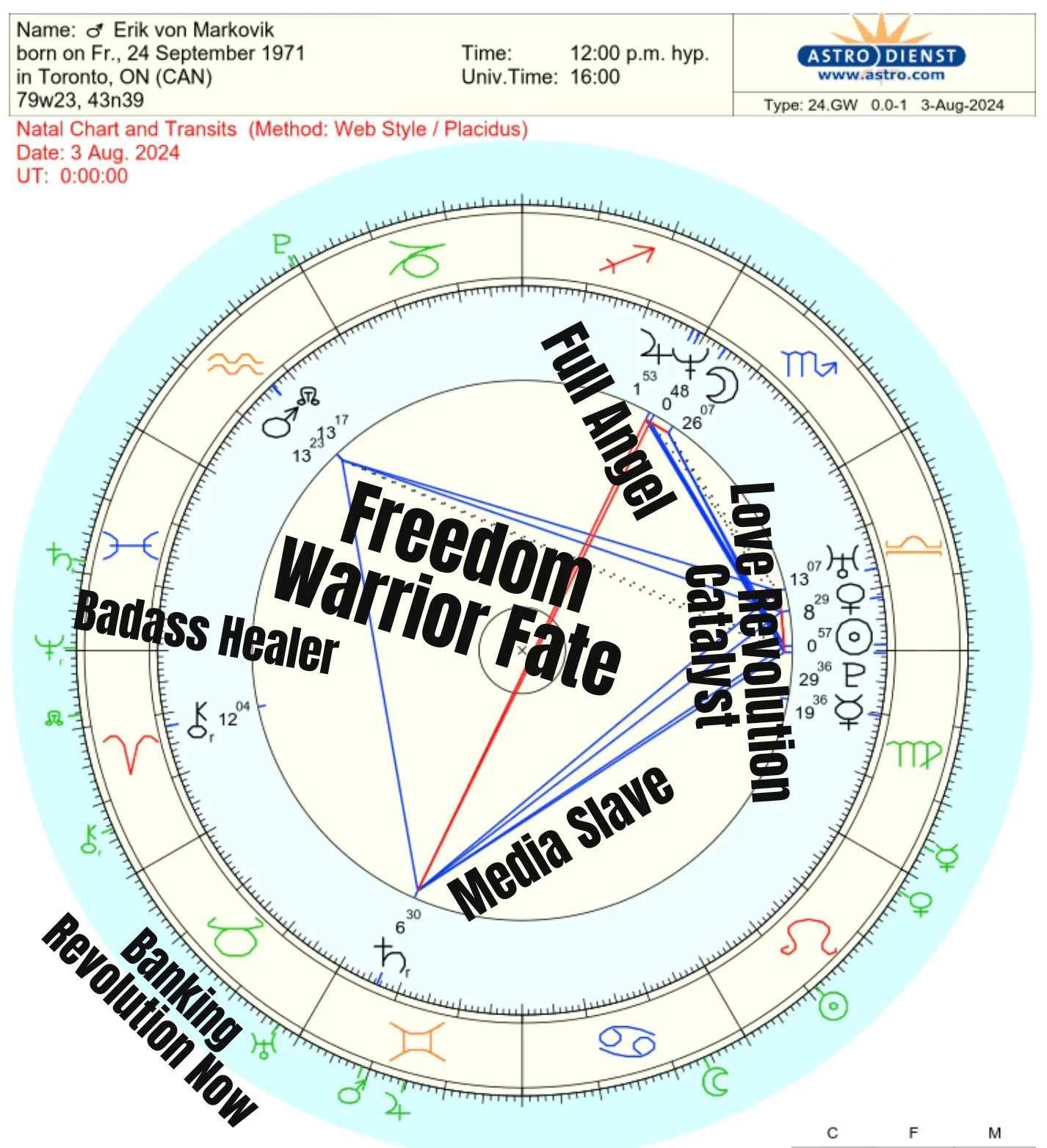 Erik gets Full Angel in the chart above because we have ultra empathic Jupiter Neptune and Moon in Free Truthful Adventurous Sagittarius, a FIRE sign.