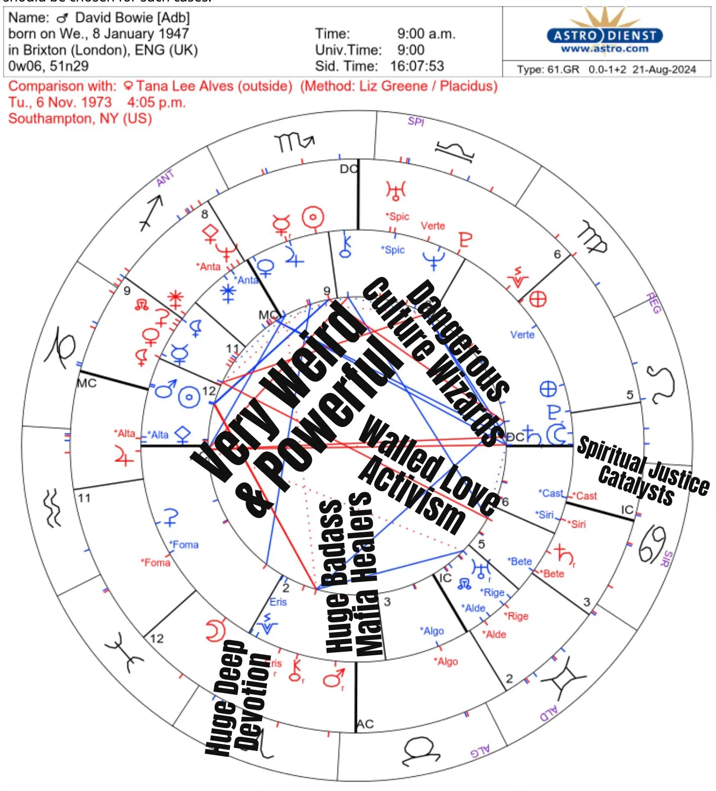 Our synastry backs up the strange tale I’m telling above - even that I’m the weirder of the 2. The chart reflects 2 media revolutionaries. I’m the 1 with tremendous Jupiter in weirdo Aquarius. But he’s right there backing me up holding his weird own with Athena the Justice Warrior in Aquarius.