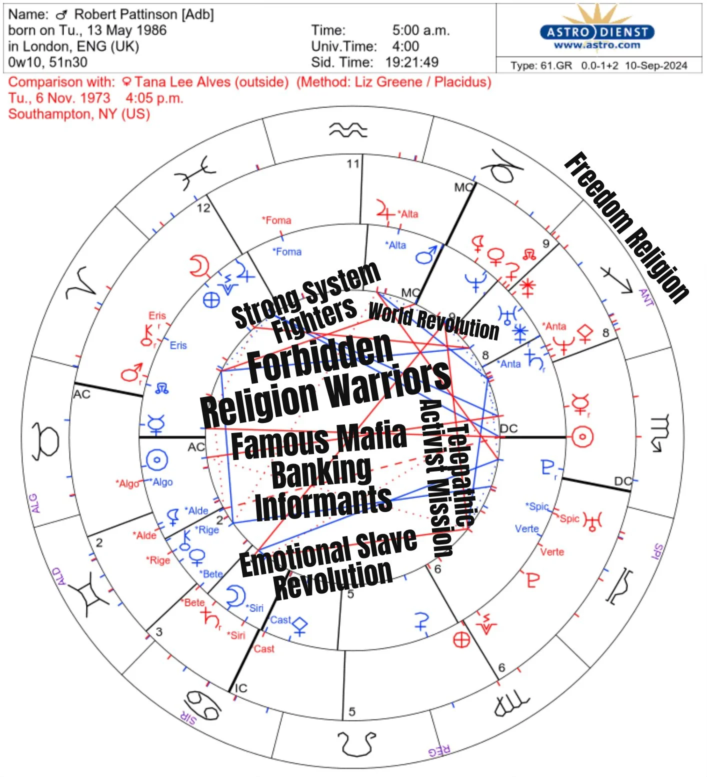 Our synastry shows we are activists in a world revolution and that we are hugely famous mafia informants.