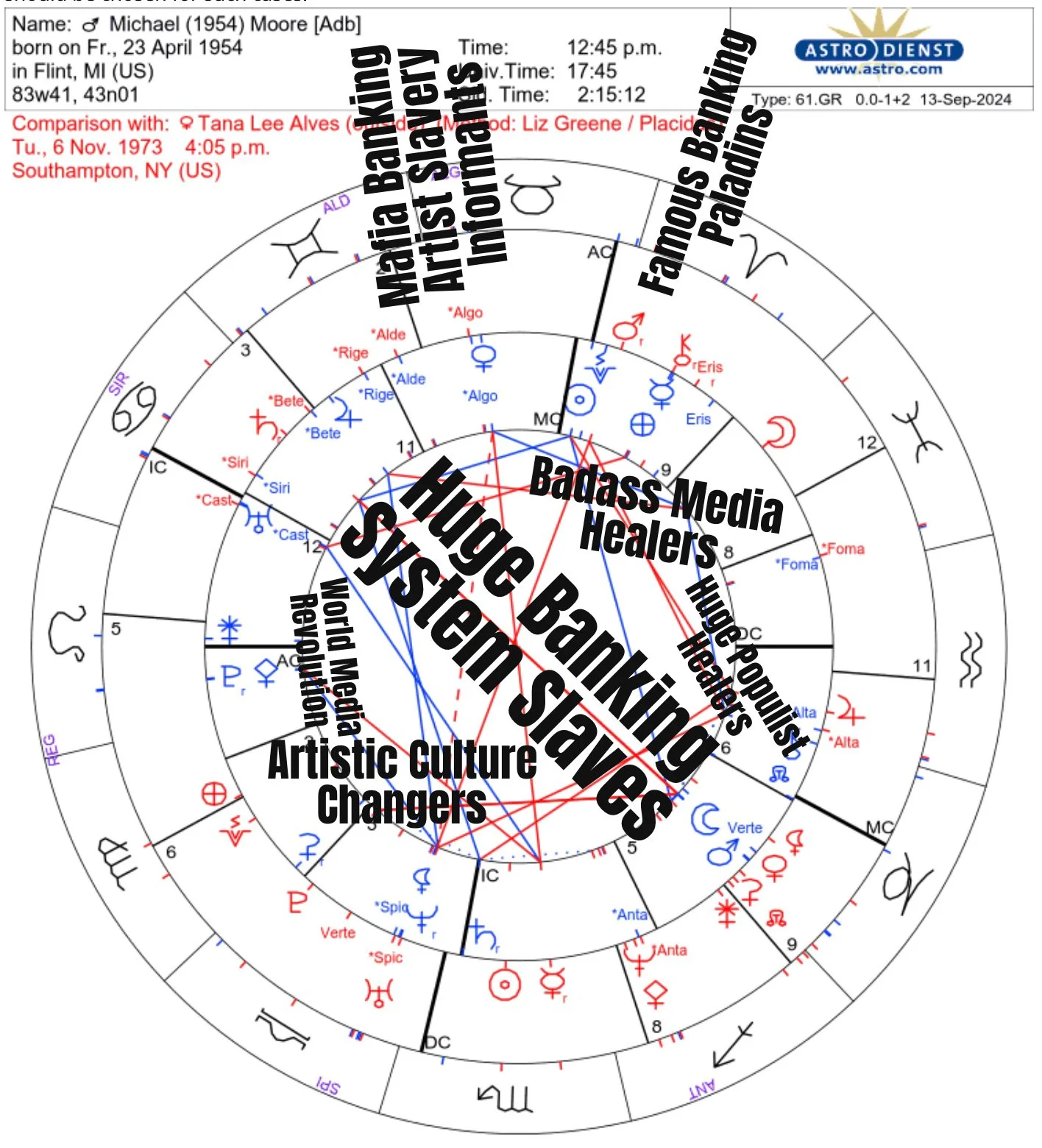 Anyone can see Michael is a fighter on a mission but I couldn’t understand it. His chart reflects that he is fighting about forbidden love and mafia banking abuse. He - like Bob Weinstein and Elvis - have Pluto in Leo. This can indicate all three are born regime changers.