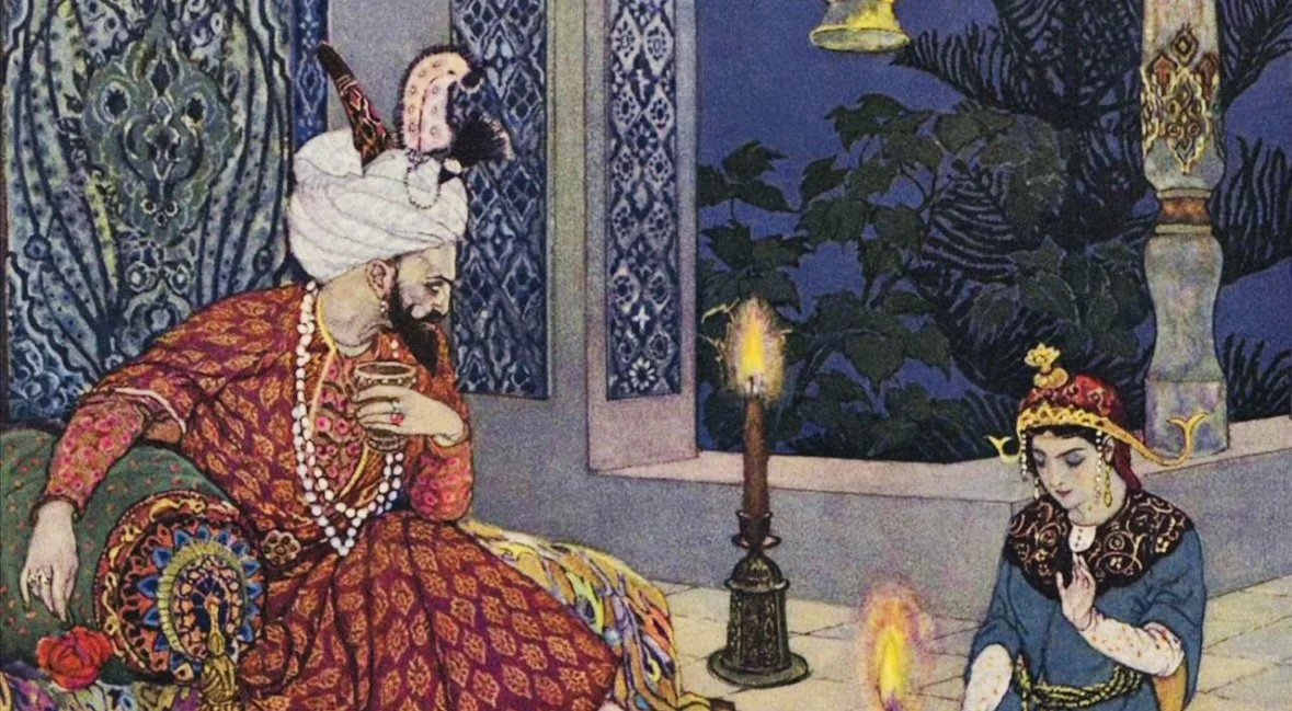 The story goes that the monarch Shahryar, on discovering that his first wife was unfaithful to him, resolved to marry a new virgin every day and to have her beheaded the next morning before she could dishonor him. Eventually, the vizier could find no more virgins of noble blood and, against her father's wishes, Scheherazade volunteered to marry the king.