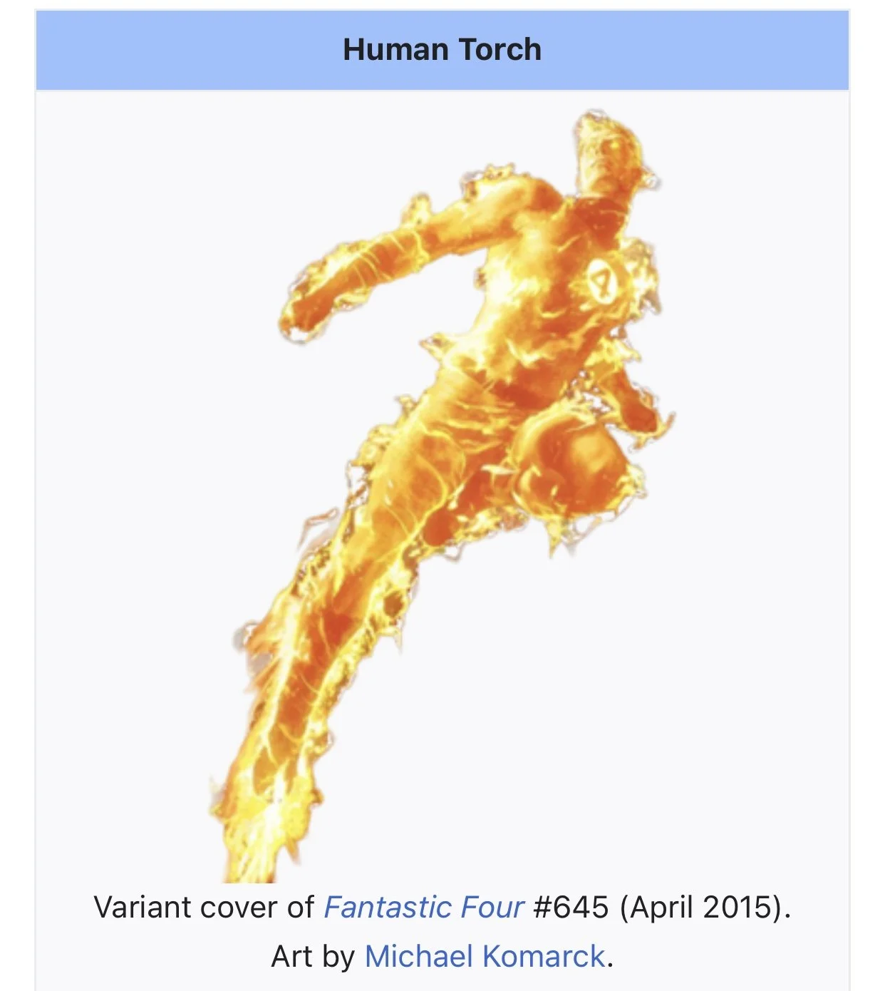 At 16, Storm joined his sister and her fiancé, Reed Richards, in a space flight in which cosmic radiation transformed those three and spacecraft pilot Ben Grimm into superpowered beings who would become the celebrated superhero team the Fantastic Four. Storm, with the ability to become a flaming human with the power of flight and the ability to project fire, dubs himself the Human Torch, in tribute to the World War II-era hero known as the Human Torch.[12] In The Fantastic Four #4, it is Storm who discovers an amnesiac hobo whom he helps regain his memory as the antihero Namor the Sub-Mariner, one of the three most popular heroes of Marvel Comics' 1940s forerunner, Timely Comics, returning him to modern continuity.