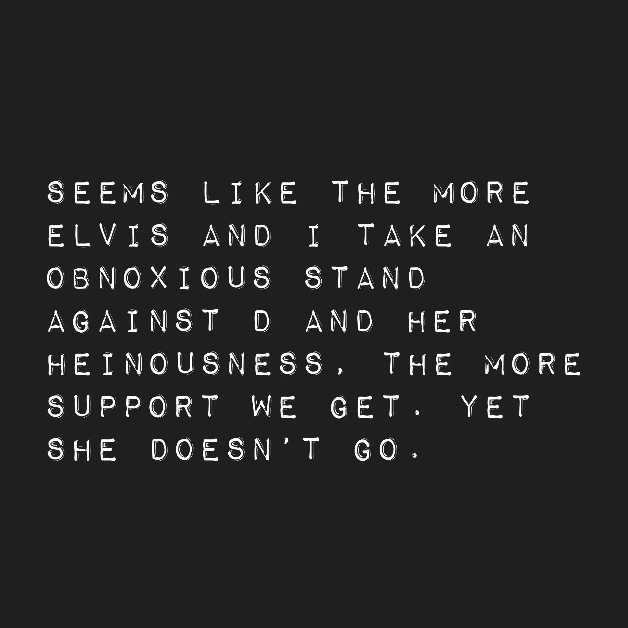 I am speaking for Elvis. He makes every effort to back me up from the true hell that he is living.