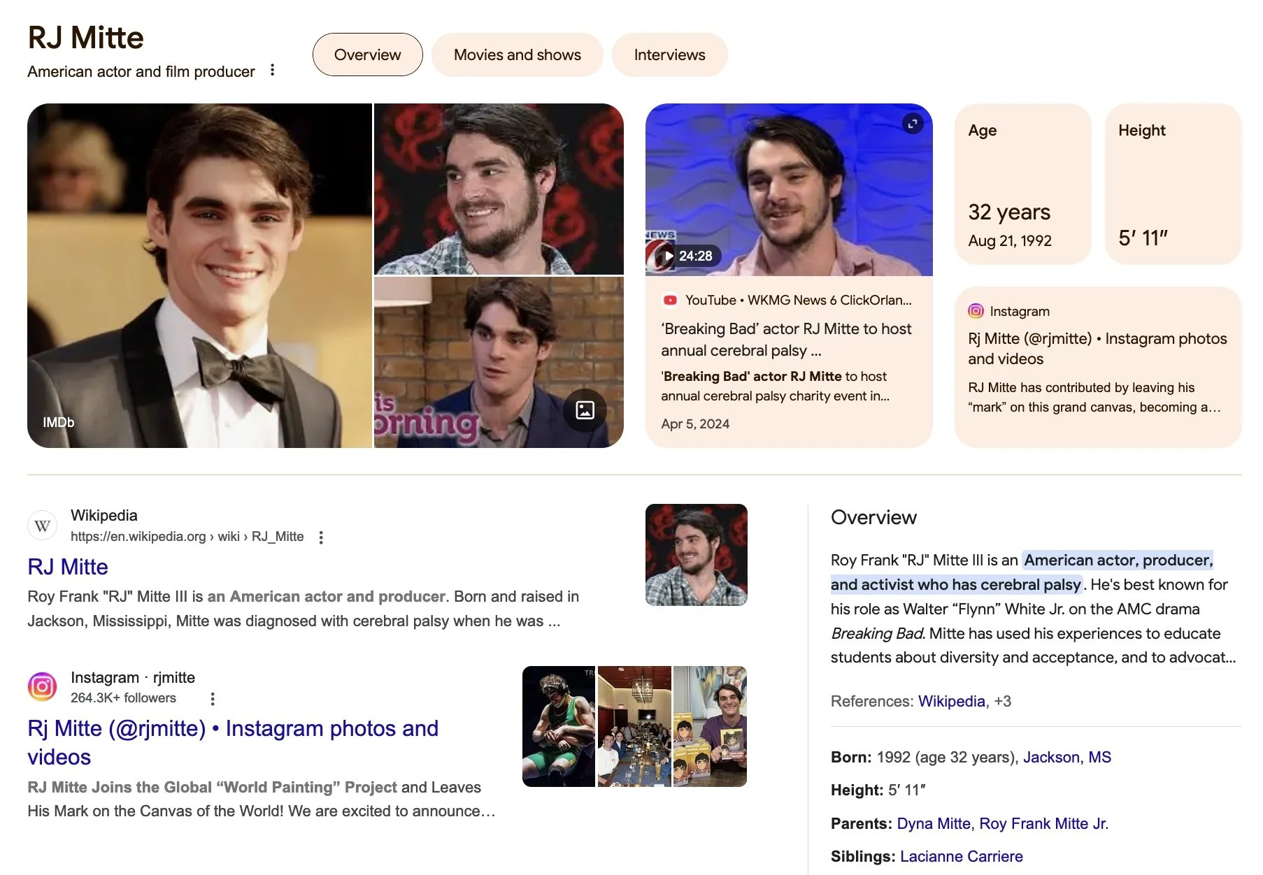 RJ is telling me that he is playing a character. He is an actor. He had me look him up on YouTube and it is just Cerebral Palsy, Cerebral Palsy, Disabilities.