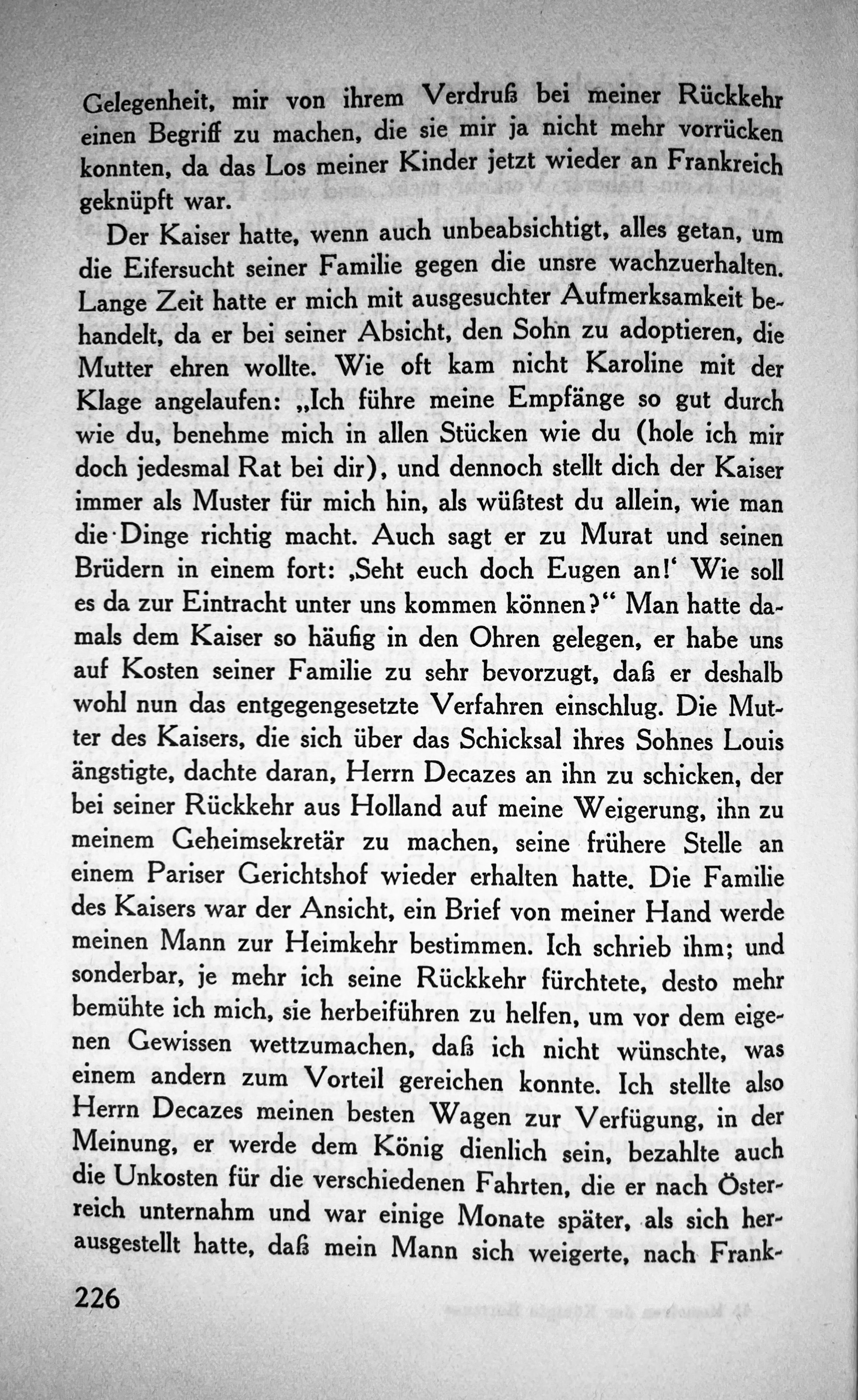 Lange Zeit hatte er mich mit ausgesuchter Aufmerksamkeit behandelt, da er bei seiner Absicht, den Sohn zu adoptieren, die Mutter ehren wollte. Wie oft kam nicht Karoline mit der Klage angelaufen: „Ich führe meine Empfänge so gut durch wie du, benehme mich in allen Stücken wie du (hole ich mir doch jedesmal Rat bei dir), und dennoch stellt dich der Kaiser immer als Muster für mich hin, als wüßtest du allein, wie man die Dinge richtig macht. Auch sagt er zu Murat und seinen Brüdern in einem fort: ,Seht euch doch Eugen an!' Wie soll es da zur Eintracht unter uns kommen können?" Man hatte damals dem Kaiser so häufig in den Ohren gelegen, er habe uns auf Kosten seiner Familie zu sehr bevorzugt, daß er deshalb wohl nun das entgegengesetzte Verfahren einschlug. Die Mutter des Kaisers, die sich über das Schicksal ihres Sohnes Louis ängstigte, dachte daran, Herrn Decazes an ihn zu schicken, der bei seiner Rückkehr aus Holland auf meine Weigerung, ihn zu meinem Geheimsekretär zu machen, seine frühere Stelle an einem Pariser Gerichtshof wieder erhalten hatte. Die Familie des Kaisers war der Ansicht, ein Brief von meiner Hand werde meinen Mann zur Heimkehr bestimmen. Ich schrieb ihm; und sonderbar, je mehr ich seine Rückkehr fürchtete, desto mehr bemühte ich mich, sie herbeiführen zu helfen, um vor dem eigenen Gewissen wettzumachen, daß ich nicht wünschte, was einem andern zum Vorteil gereichen konnte. Ich stellte also Herr Decazes meinen besten Wagen zur Verfügung, in der Meinung, er were dem König dienlich sein, bezahlte auch die Unkosten für die verschiedenen Fahrten, die er nach Österreich unternahm und war einige Monate später, als sich herausgestellt hatte, daf mein Mann sich weigerte, nach Frank reich zurückzukehren, sehr froh darüber, daß ich mir keinerlei Vorwürfe wegen dieses seines Fernbleibens zu machen hätte.