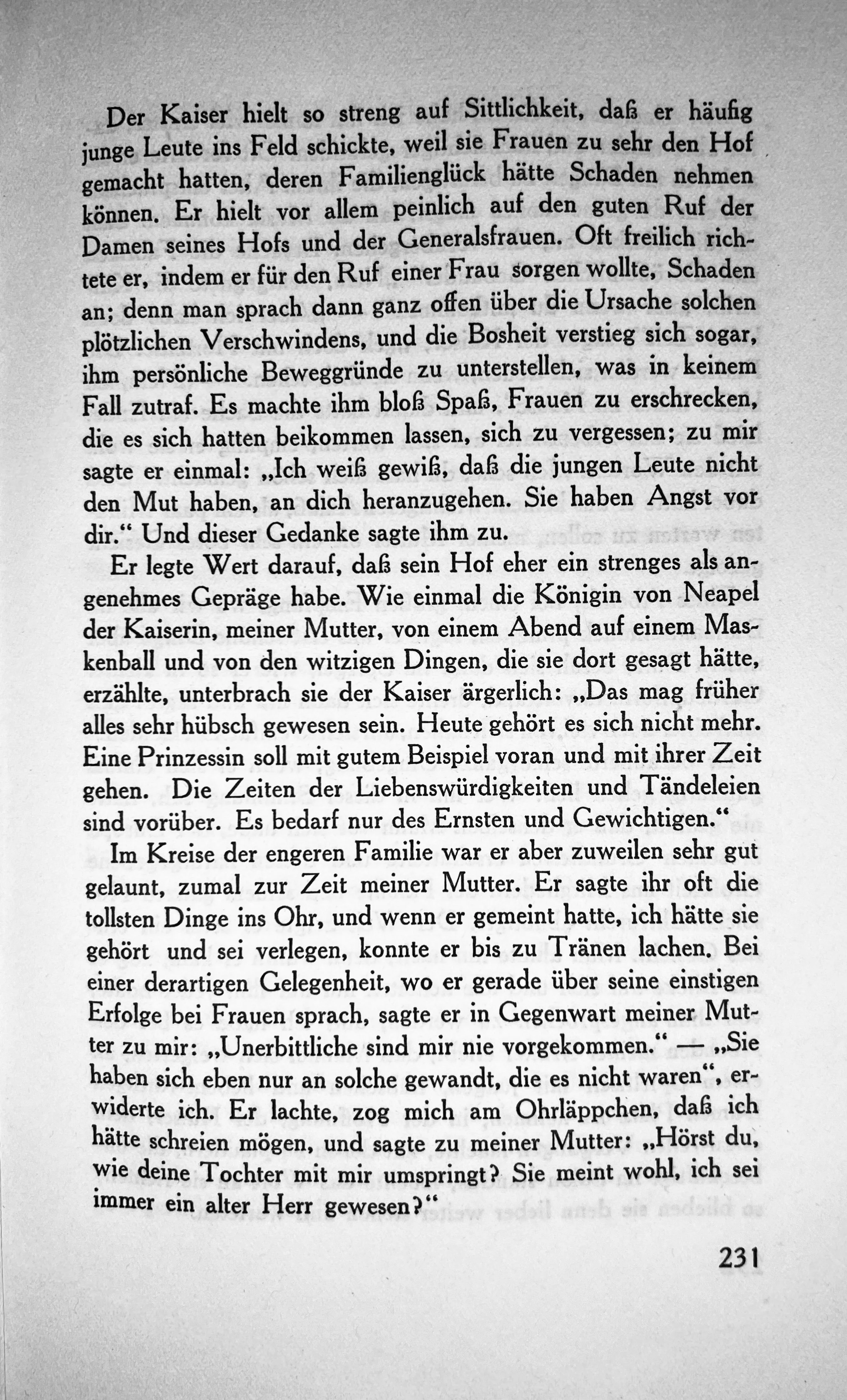 Er legte Wert darauf, das sein Hof her ein strenges als angenehmes Gepräge habe. Wie einmal die Königin von Neapel der Kaiserin, meiner Mutter, von einem Abend auf einem Maskenball und von den witzigen Dingen, die sie dort gesagt hätte, erzählte, unterbrach sie der Kaiser ärgerlich: „Das mag früher alles sehr hübsch gewesen sein. Heute gehört es sich nicht mehr. Eine Prinzessin soll mit gutem Beispiel voran und mit ihrer Zeit gehen. Die Zeiten der Liebenswürdigkeiten und Tändeleien sind vorüber. Es bedarf nur des Ernsten und Gewichtigen."