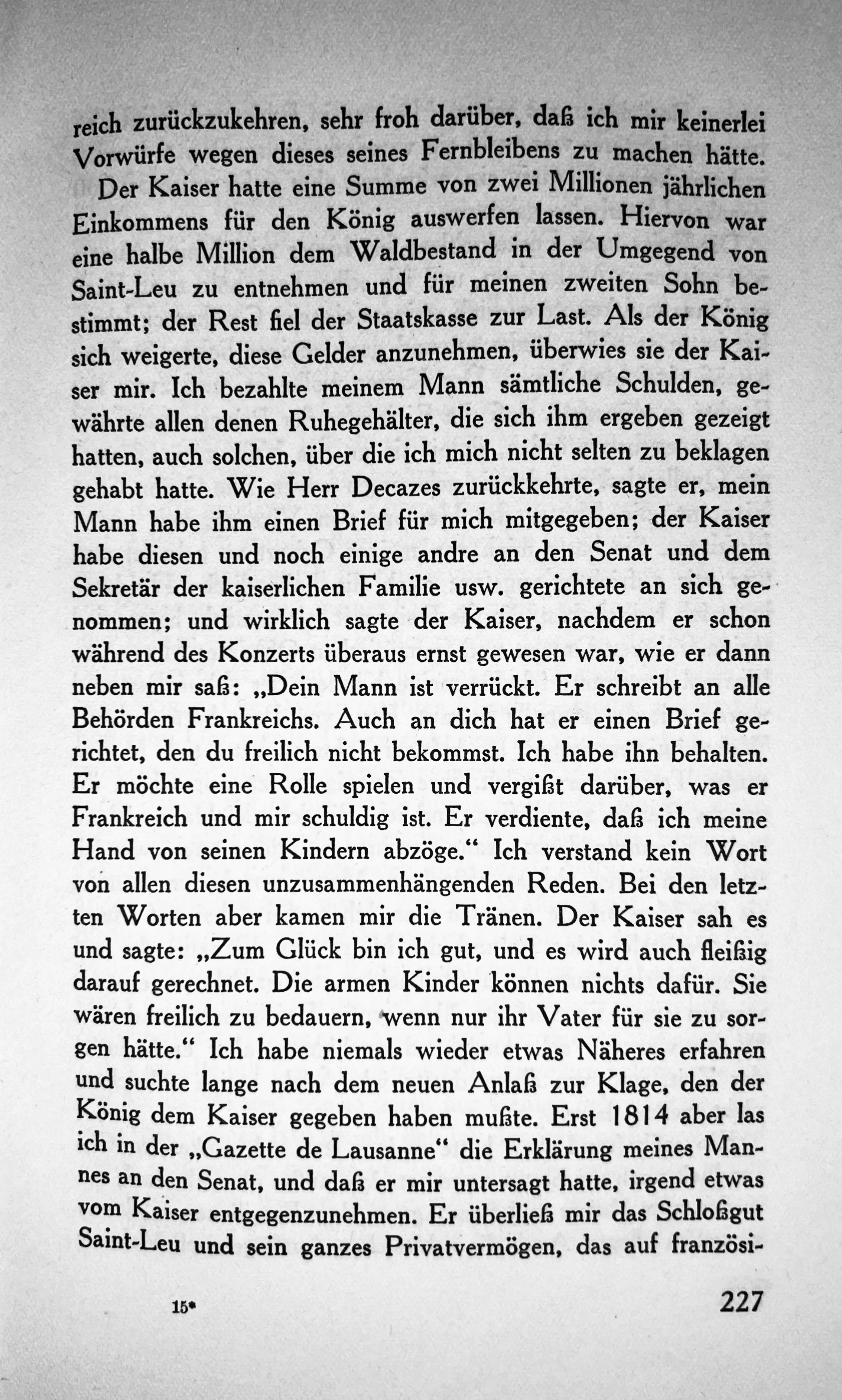 Der Kaiser hatte eine Summe von zwei Millionen jährlichen Einkommens für den König auswerfen lassen. Hiervon war eine halbe Million dem Waldbestand in der Umgegend von Saint-Leu zu entnehmen und für meinen zweiten Sohn bestimmt; der Rest fiel der Staatskasse zur Last. Als der König sich weigerte, diese Gelder anzunehmen, überwies sie der Kaiser mir. Ich bezahlte meinem Mann sämtliche Schulden, gewährte allen denen Ruhegehälter, die sich hm ergeben gezeigt hatten, auch solchen, über die ich mich nicht selten zu beklagen gehabt hatte. Wie Herr Decazes zurückkehrte, sagte er, mein Mann habe ihm einen Brief für mich mitgegeben; der Kaiser habe diesen und noch einige andre an den Senat und dem Sekretär der kaiserlichen Familie usw, gerichtete an sich genommen; und wirklich sagte der Kaiser, nachdem er schon