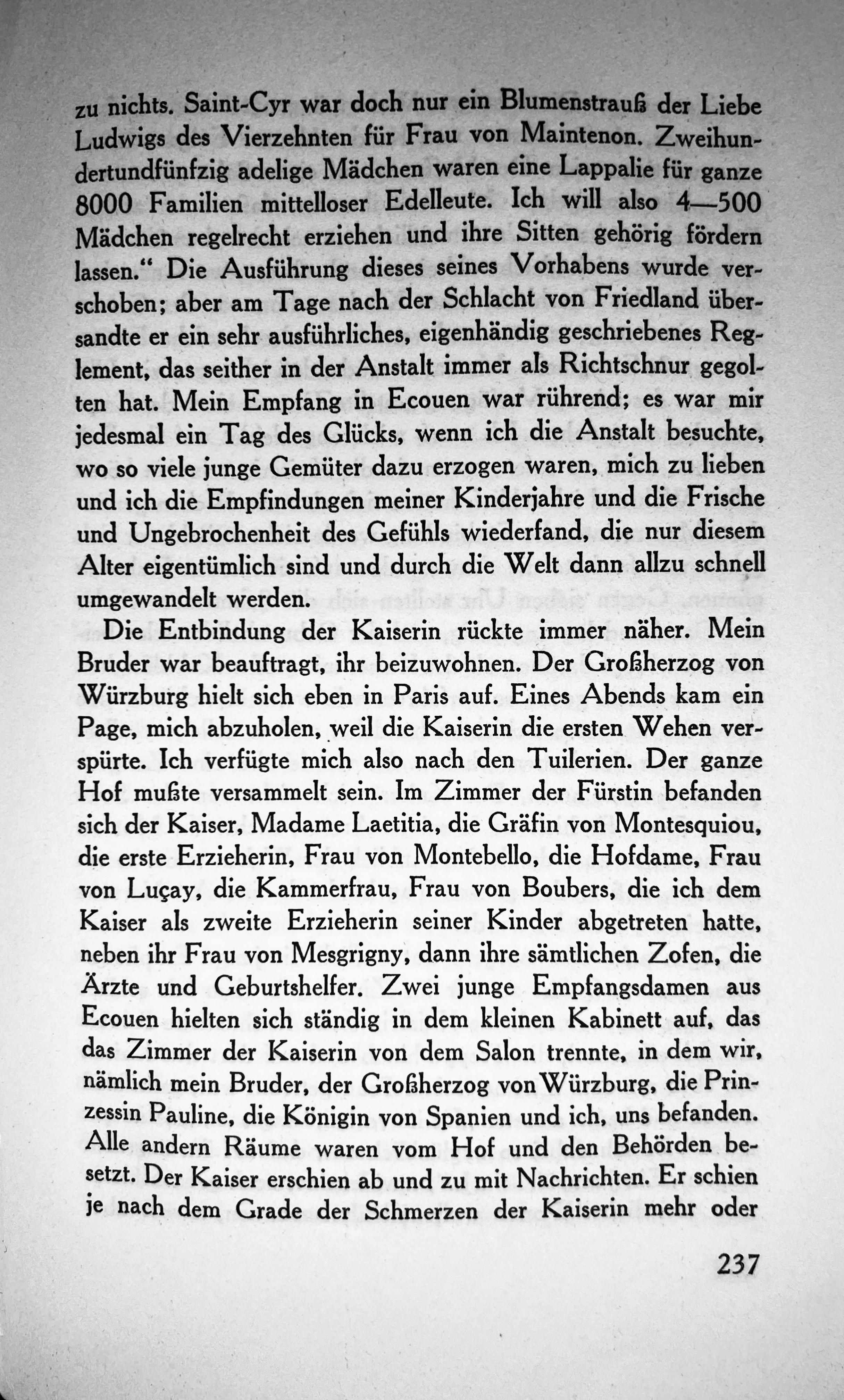 Die Ausführung dieses seines Vorhabens wurde verschoben; aber am Tage nach der Schlacht von Friedland übersandte er ein sehr ausführliches, eigenhändig geschriebenes Reglement, das seither in der Anstalt immer als Richtschnur gegolten hat. Mein Empfang in Ecouen war rührend; es war mir jedesmal ein Tag des Glücks, wen ich die Anstalt besuchte, wo so vile junge Gemüter dazu erzogen waren, mich zu lieben und ich die Empfindungen meiner Kinderjahre und die Frische und Ungebrochenheit des Gefühls wiederfand, die nur diesem Alter eigentümlich sind und durch die Welt dan allzu schnell umgewandelt werden. Die Entbindung der Kaiserin rückte immer näher. Mein Bruder war beauftragt, ihr beizuwohnen. Der Großherzog von Würzburg hielt sich eben in Paris auf. Eines Abends kam ein Page, mich abzuholen, weil die Kaiserin die ersten Wehen verspürte. Ich verfügte mich also nach den Tuilerien. Der ganze Hof musste versammelt sein. Im Zimmer der Fürstin befanden sich der Kaiser, Madame Laetitia, die Gräfin von Montesquiou, die erste Erzieherin, Frau von Montebello, die Hofdame, Frau von Luçay, die Kammerfrau, Frau von Boubers, die ich dem Kaiser als zweite Erzieherin seiner Kinder abgetreten hatte, neben ihr Frau von Mesgrigny, dann ihre sämtlichen Zofen, die Ärzte und Geburtshelfer. Zwei junge Empfangsdamen aus Ecouen hielten sich ständig in dem kleinen Kabinett auf, das das Zimmer der Kaiserin von dem Salon trennte, in dem wir, nämlich mein Bruder, der Großherzog von Würzburg, die Prinzessin Pauline, die Königin von Spanien und ich, uns befanden. All andern Räume waren vom Hof und den Behörden besetzt. Der Kaiser erschien ab und zu mit Nachrichten. Er schien je nach dem Grade der Schmerzen der Kaiserin mehr oder