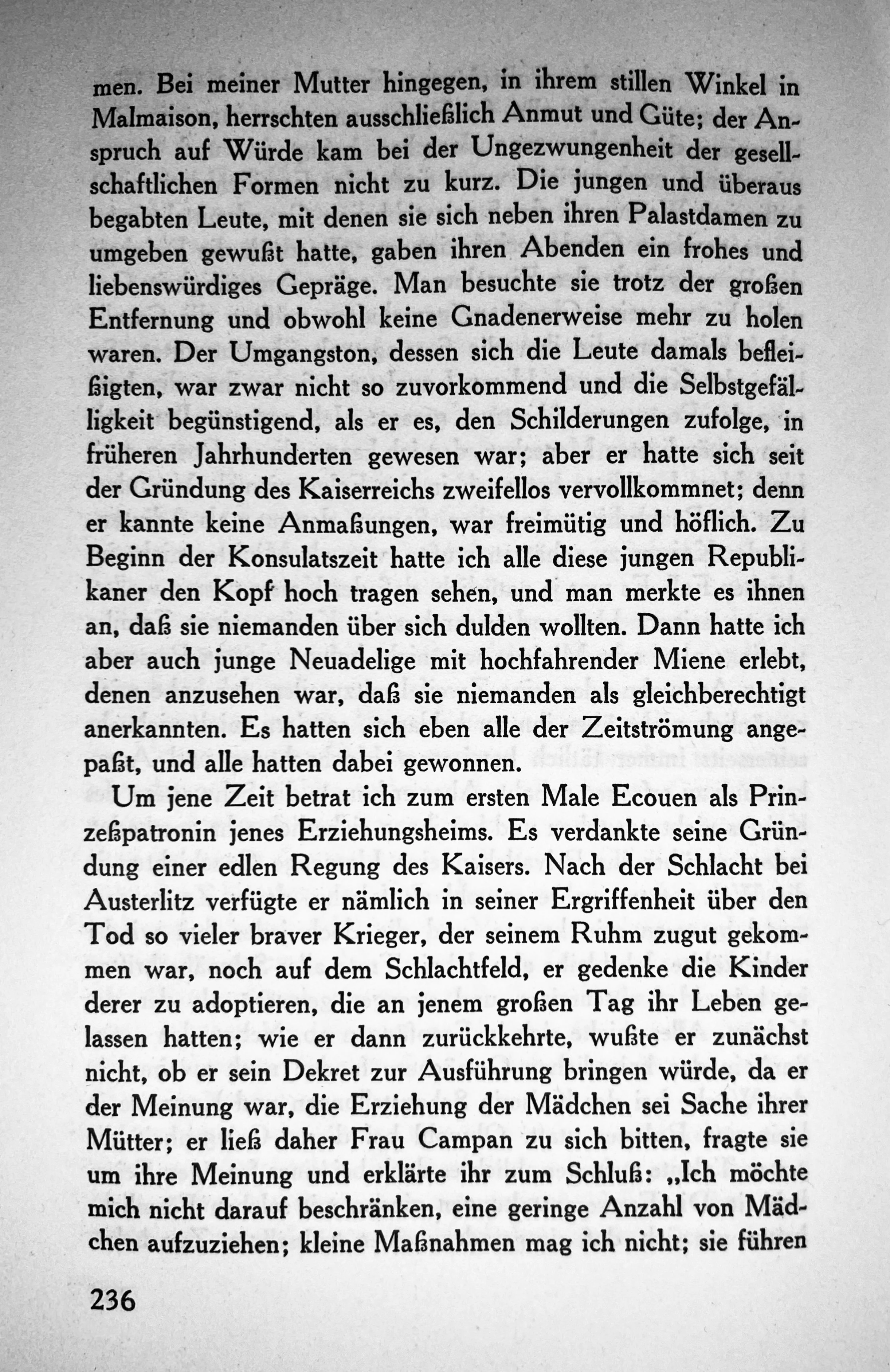 Um jene Zeit betrat ich zum ersten Male Ecouen als Prinzesspatronin jenes Erziehungsheims. Es verdankte seine Gründung einer edlen Regung des Kaisers. Nach der Schlacht bei Austerlitz verfügte er nämlich in seiner Ergriffenheit über den Tod so vieler braver Krieger, der seinem uhm zugut gekommen war, noch auf dem Schlachtfeld, er gedenke die Kinder derer zu adoptieren, die an jenem grossen Tag ihr Leben gelassen hatten; wie er dann zurückkehrte, wusste er zunächst nicht, ob er sein Dekret zur Ausführung bringen würde, da er der Meinung war, die Erziehung der Mädchen sei Sache ihrer Mütter; er ließ daher Frau Campan zu sich bitten, fragte sie um ihre Meinung und erklärte ihr zum Schluß: „Ich möchte mich nicht darauf beschränken, eine geringe Anzahl von Mädchen aufzuziehen; kleine Maßnahmen mag ich nicht; sie führen zu nichts. Saint-Cyr war doch nur ein Blumenstrauf der Liebe Ludwigs des Vierzehnten für Frau von Maintenon. Zweihundertundfünfzig adelige Mädchen warn eine Lappalie für ganze 8000 Familien mittelloser Edelleute. Ich will also 4 -500 Mädchen regelrecht erziehen und ire Sitten gehörig fördern lassen."
