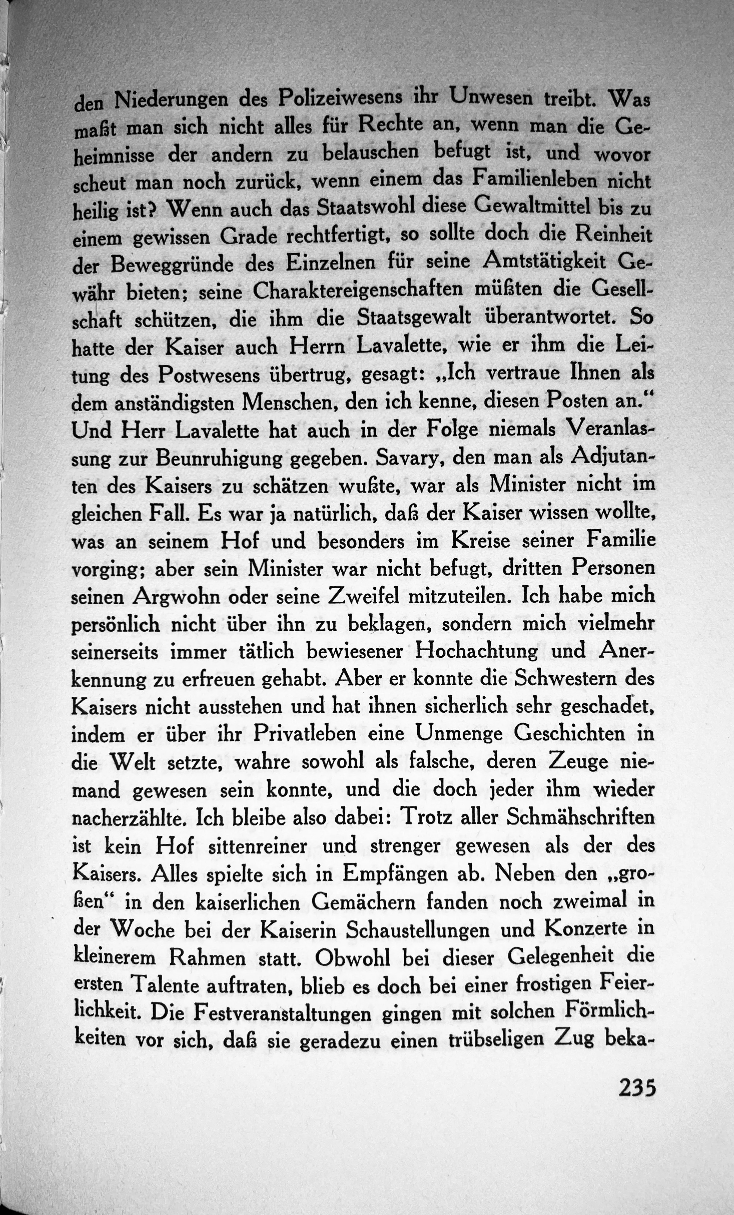 Der Herzog von Rovigo mag über Geist verfügt haben, auch über Unerschrockenheit, Ergebenheit dem Kaiser gegenüber und noch andre Vorzüge; aber nur unerschütterliche Charakterstärke ist imstande, vor der Verderbnis zu bewahren, die in den Niederungen des Polizeiwesens ihr Unwesen treibt. Was masst man sich nicht alles für Rechte an, wenn man die Geheimnisse der andern zu belauschen befugt ist, und wovor scheut man noch zurück, wenn einem das Familienleben nicht heilig ist? Wenn auch das Staatswohl diese Gewaltmittel bis zu einem gewissen Grade rechtfertigt, so sollte doch die Reinheit der Beweggründe des Einzelnen für seine Amtstätigkeit Gewähr bieten; seine Charaktereigenschaften müßten die Gesellschaft schützen, die ihm die Staatsgewalt überantwortet. So hatte der Kaiser auch Herrn Lavalette, wie er ihm die Leitung des Postwesens übertrug, gesagt: „Ich vertraue Ihnen als dem anständigsten Menschen, den ich kenne, diesen Posten an.