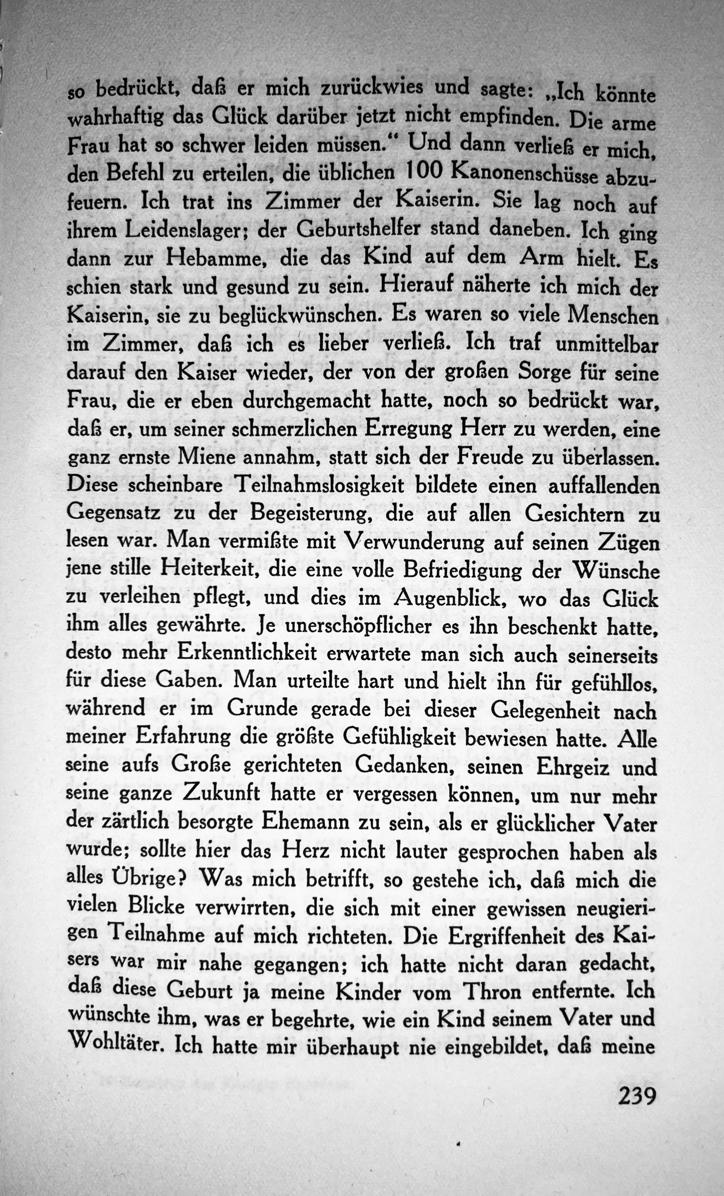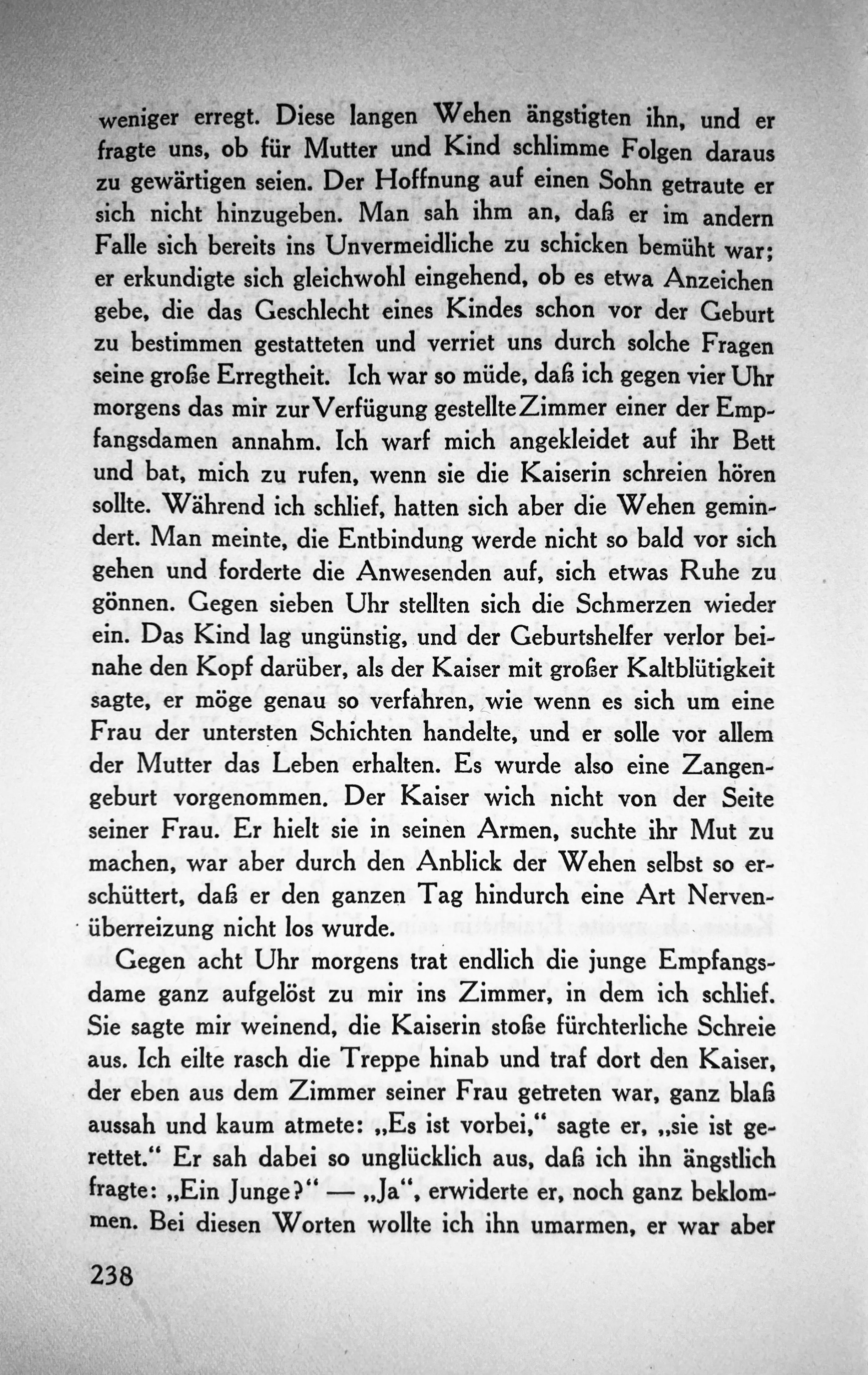 weniger erregt. Diese langen Wehen ängstigten ihn, und er fragte uns, ob für Mutter und Kind schlimme Folgen daraus zu gewärtigen seien. Der Hoffnung auf einen Sohn getraute er sich nicht hinzugeben. Man sah ihm an, das er im andern Falle sich berets ins Unvermeidliche zu schicken bemüht war; er erkundigte sich gleichwohl eingehend, ob es etwa Anzeichen gebe, die das Geschlecht eines Kindes schon vor der Geburt zu bestimmen gestatteten und verriet uns durch solche Fragen seine große Erregtheit. Ich war so müde, das ich gegen vier Uhr morgens das mir zur Verfügung gestellte Zimmer einer der Empfangsdamen annahm. Ich warf mich angekleidet auf ihr Bett und bat, mich zu rufen, wenn sie die Kaiserin schreien hören sollte. Während ich schlief, hatten sich aber die Wehen gemindert. Man meinte, die Entbindung were nicht so bald vor sich gehen und forderte die Anwesenden auf, sich etwas Ruhe zu gönnen. Gegen sieben Uhr stellten sich die Schmerzen wieder ein. Das Kind lag ungünstig, und der Geburtshelfer verlor beinahe den Kopf darüber, als der Kaiser mit großer Kaltblütigkeit sagte, er möge genau so verfahren, wie wenn es sich um eine Frau der untersten Schichten handelte, under sole vor allem der Mutter das Leben erhalten. Es wurde also eine Zangengeburt vorgenommen. Der Kaiser wich nicht von der Seite seiner Frau. Er hielt sie in seinen Armen, suchte ihr Mut zu machen, war aber durch den Anblick der Wehen selbst so erschüttert, da er den ganzen Tag hindurch eine Art Nervenüberreizung nicht los wurde.