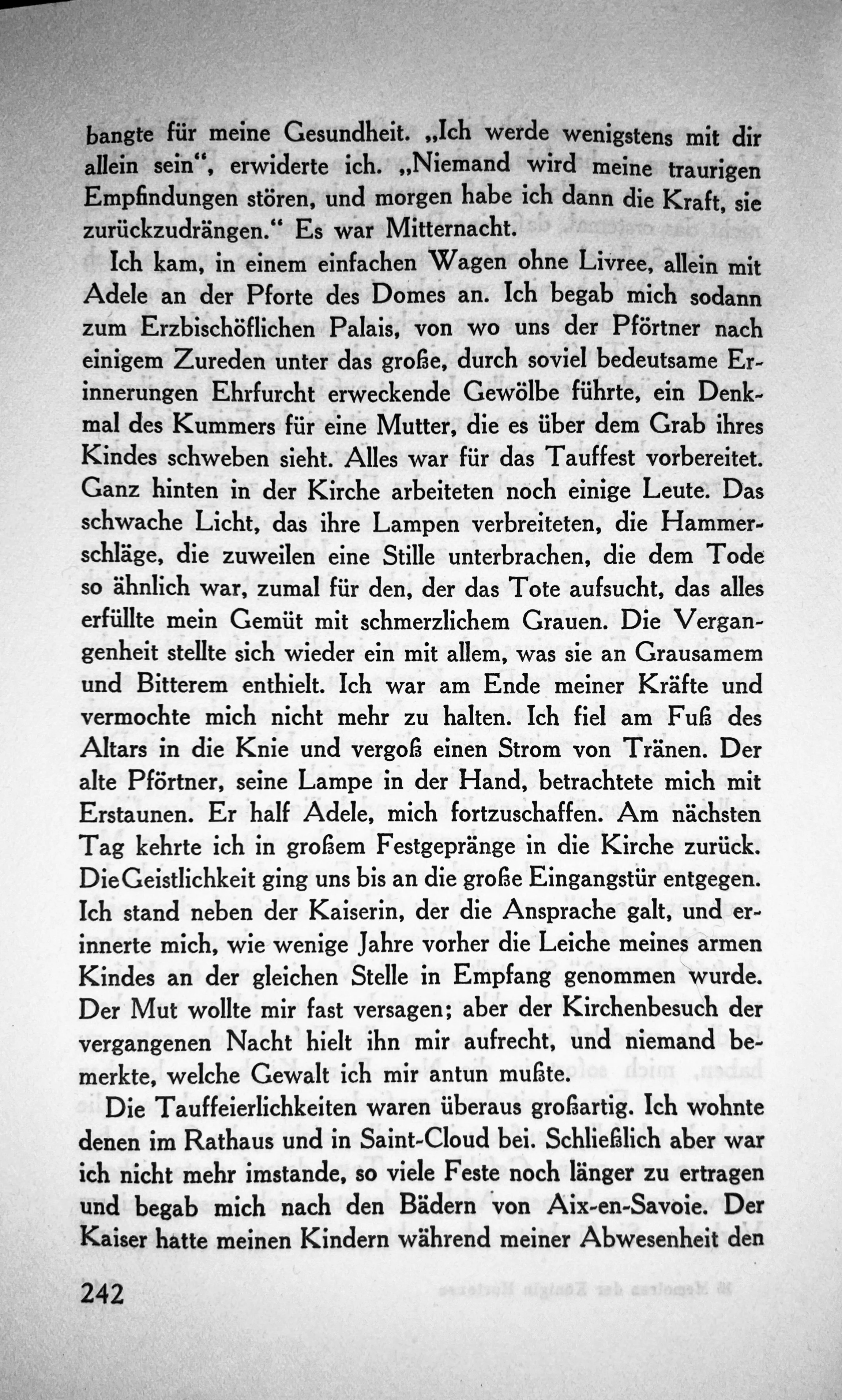„Ich werde meine Empfindungen nicht beherrschen können" sagte ich zu Adele. „Muss ich denn nicht vermeiden, das es in aller Öffentlichkeit zu einem peinlichen Auftritt kommt?" Sie stellte mir die Verstimmung des Kaisers vor Augen, der mich anklagen würde, ohne mich zu verstehen. Endlich entschloss ich mich, um alles Erforderliche getan zu haben, mich sofort in die Notre-Dame-Kirche zu begeben und in der Einsamkeit den Empfindungen zu überlassen, die mich dort befallen mussten; ich wollte mich in die Gewalt bekommen, um meine Gefühle am Tage darauf desto sicherer überwinden zu können. Adele widersetzte sich diesem meinem Vorhaben. Sie fürchtete, ich möchte mich zu stark erregen, und bangte für meine Gesundheit. „Ich were wenigstens mit dir allein sein" erwiderte ich. „Niemand wird meine traurigen Empfindungen stören, und morgen habe ich dan die Kraft, sie zurückzudrängen." Es war Mitternacht.