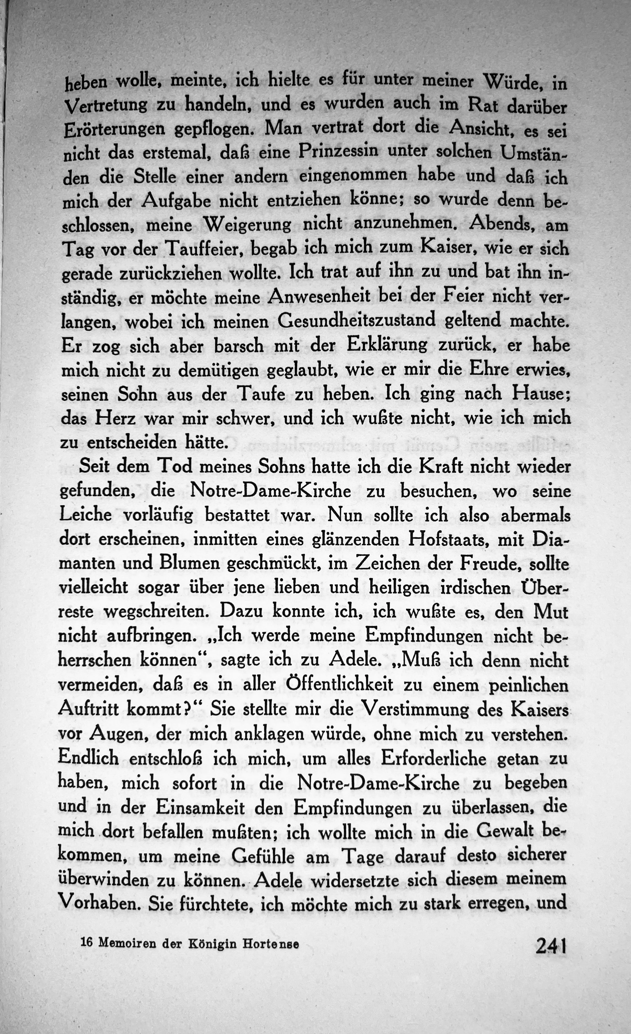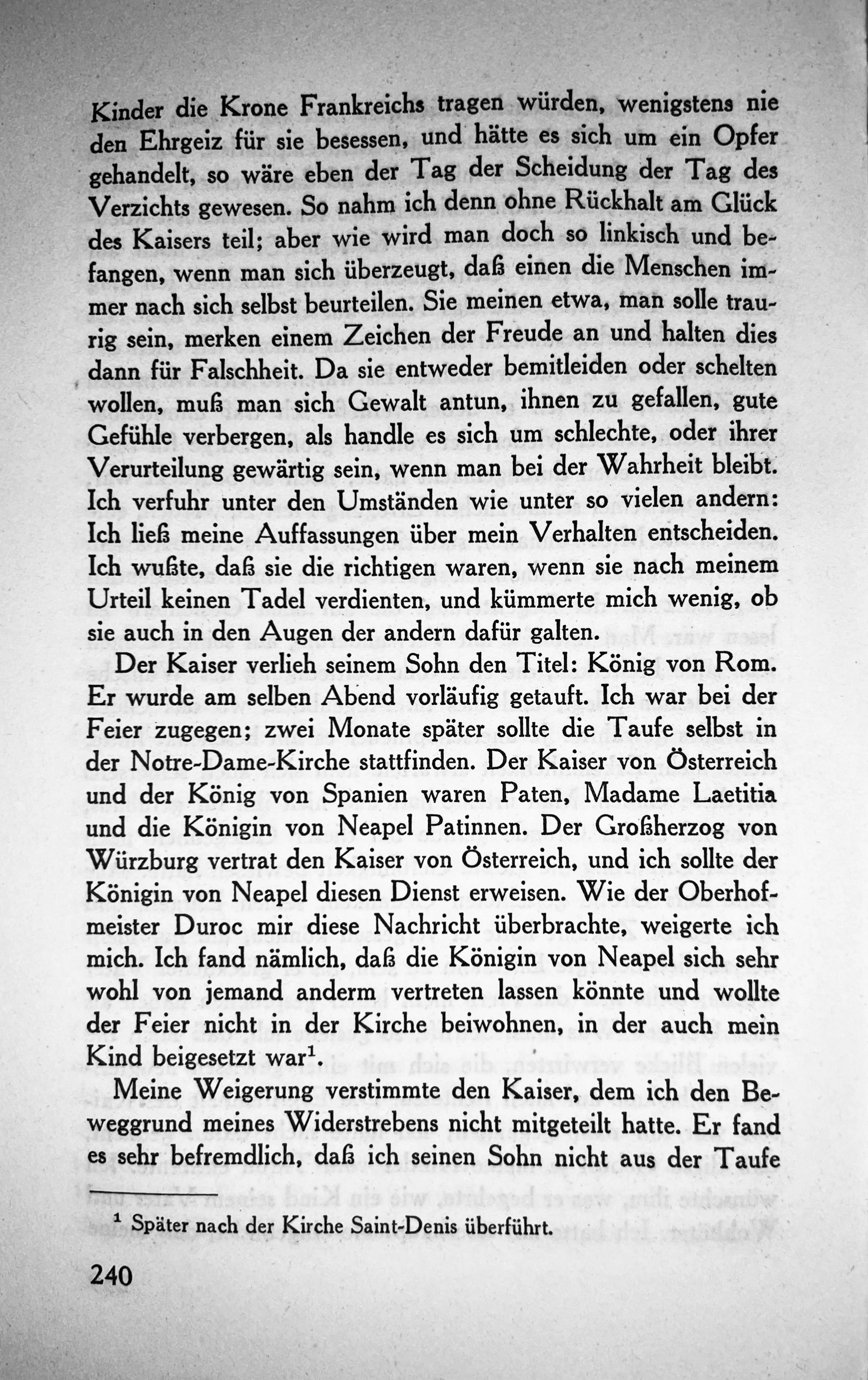 Der Kaiser verlieh seinem Sohn den Titel: König von Rom. Er wurde am selben Abend vorläufig getauft. Ich war bei der Feier zugegen; zwei Monate später sollte die Taufe selbst in der Notre-Dame-Kirche stattfinden. Der Kaiser von Österreich und der König von Spanien waren Paten, Madame Laetitia und die Königin von Neapel Patinnen. Der Großherzog von Würzburg vertrat den Kaiser von Österreich, und ich sollte der Königin von Neapel diesen Dienst erweisen. Wie der Oberhofmeister Duroc mir diese Nachricht überbrachte, weigerte ich mich. Ich fand nämlich, daß die Königin von Neapel sich sehr wohl von jemand anderm vertreten lassen könnte und wollte der Feier nicht in der Kirche beiwohnen, in der auch mein Kind beigesetzt warl Meine Weigerung verstimmte den Kaiser, dem ich den Beweggrund meines Widerstrebens nicht mitgeteilt hatte. Er fand es sehr befremdlich, das ich seinen Sohn nicht aus der Taufe heben wolle, meinte, ich hielte es für unter meiner Würde, in Vertretung zu handeln, und es wurden auch im Rat darüber Erörterungen gepflogen. Man vertrat dort die Ansicht, es sei nicht das erstemal, das eine Prinzessin unter solchen Umständen die Stelle einer andern eingenommen habe und da ich mich der Aufgabe nicht entziehen könne; so wurde denn beschlossen, meine Weigerung nicht anzunehmen. Abends, am Tag vor der Tauffeier, begab ich mich zum Kaiser, wie er sich gerade zurückziehen wollte. Ich trat auf ihn zu und bat ihn inständig, er möchte meine Anwesenheit bei der Feier nicht verlangen, wobei ich meinen Gesundheitszustand geltend machte.