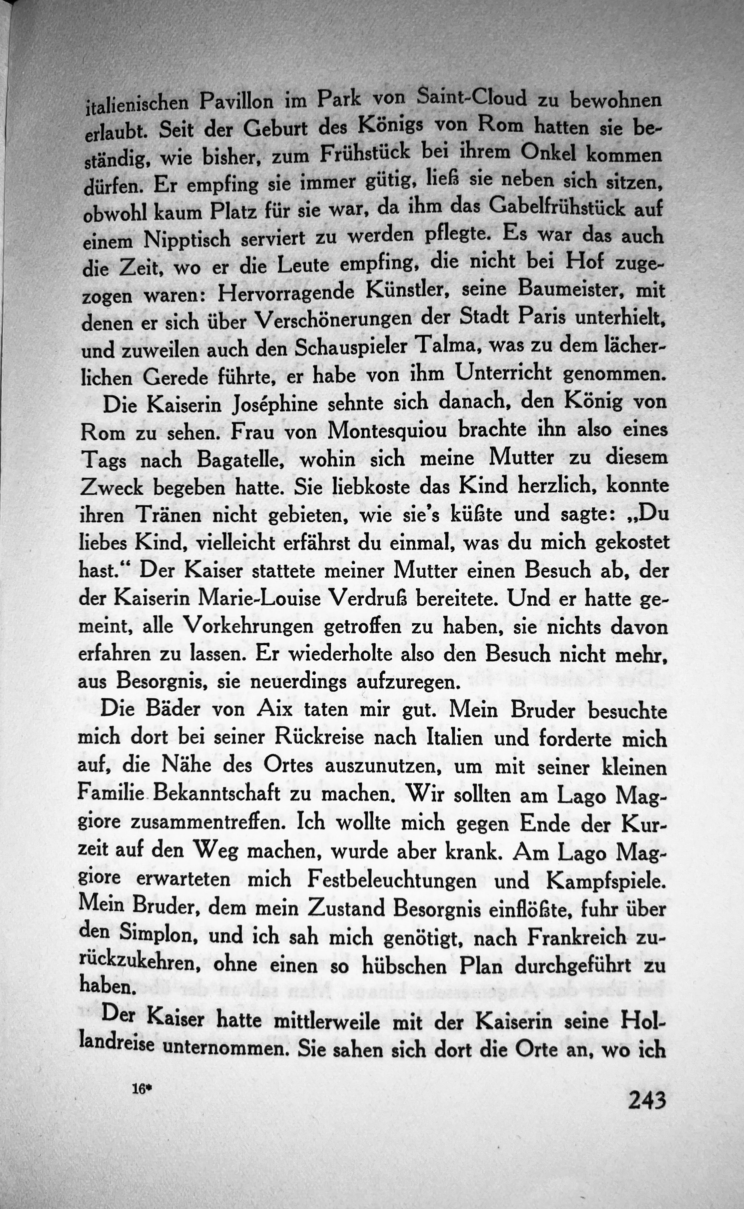 Die Tauffeierlichkeiten waren überaus großartig. Ich wohnte denen im Rathaus und in Saint-Cloud bei. Schließlich aber war ich nicht mehr imstande, so viele Feste noch länger zu ertragen und begab mich nach den Bädern von Aix-en-Savoie. Der Kaiser hatte meinen Kindern während meiner Abwesenheit den italienischen Pavillon im Park von Saint-Cloud zu bewohnen erlaubt. Seit der Geburt des Königs von Rom hatten sie beständig, wie bisher, zum Frühstück bei ihrem Onkel kommen dürfen. Er empfing sie immer gütig, lief sie neben sich sitzen, obwohl kaum Platz für sie war, da ihm das Gabelfrühstück auf einem Nipptisch serviert zu werden pflegte. Es war das auch die Zeit, wo er die Leute empfing, die nicht bei Hof zugezogen waren: Hervorragende Künstler, seine Baumeister, mit denen er sich über Verschönerungen der Stadt Paris unterhielt, und zuweilen auch den Schauspieler Talma, was zu dem lächerlichen Gerede führte, er habe von ihm Unterricht genommen.