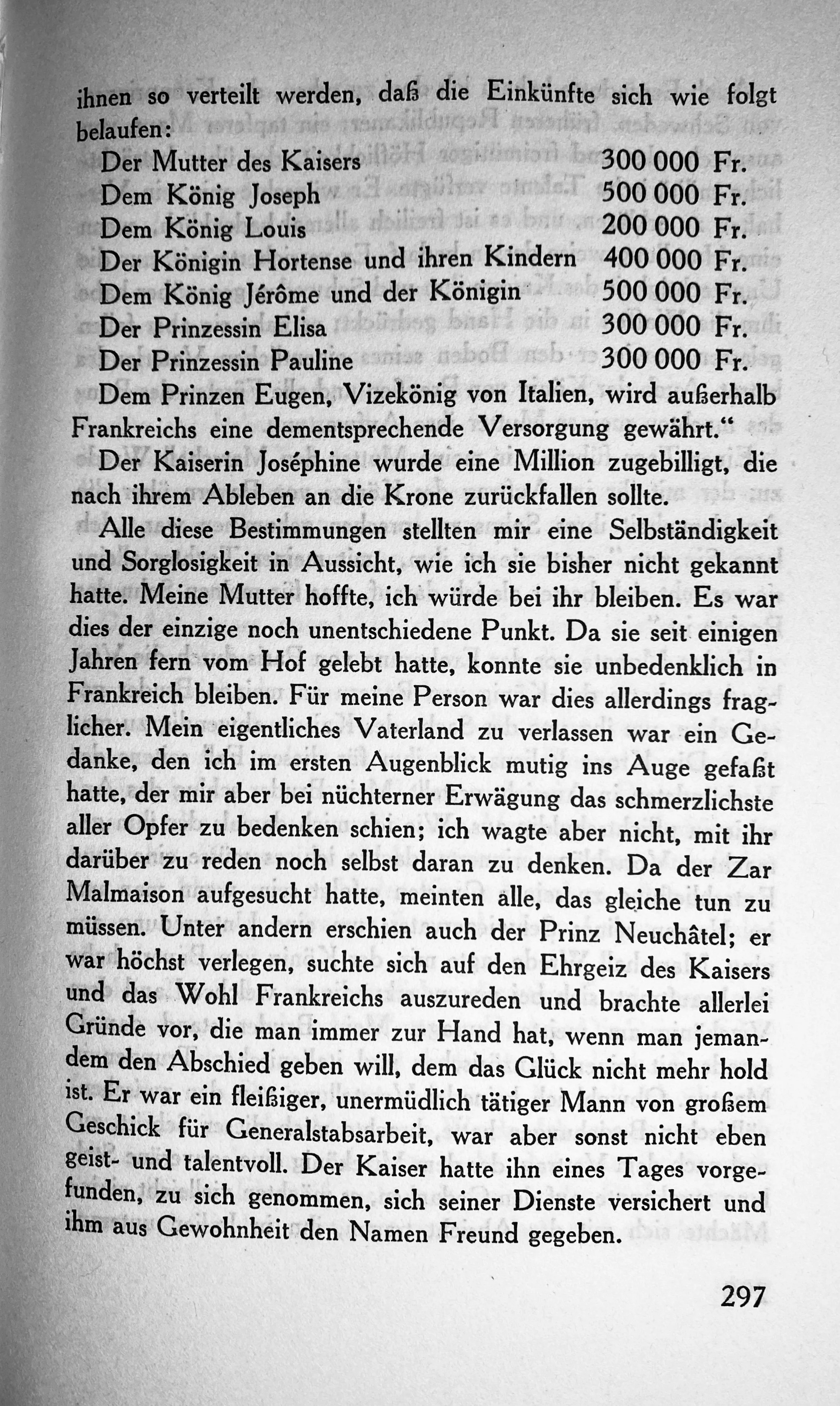 All diese Bestimmungen stellten mir eine Selbständigkeit und Sorglosigkeit in Aussicht, wie ich sie bisher nicht gekannt hatte. Meine Mutter hoffte, ich würde bei ihr bleiben. Es war dies der einzige noch unentschiedene Punkt. Da sie seit einigen Jahren fern vom Hof gelebt hatte, konnte sie unbedenklich in Frankreich bleiben. Für meine Person war dies allerdings fraglicher. Mein eigentliches Vaterland zu verlassen war ein Gedanke, den ich im ersten Augenblick mutig ins Auge gefasst hatte, der mir aber bei nüchterner Erwägung das schmerzlichste aller Opfer zu bedenken schien; ich wagte aber nicht, mit ihr darüber zu reden noch selbst daran zu denken. Da der Zar Malmaison aufgesucht hatte, meinten alle, das gleiche tun zu müssen. Unter andern erschien auch der Prinz Neuchâtel; er war höchst verlegen, suchte sich auf den Ehrgeiz des Kaisers und das Wohl Frankreichs auszureden und brachte allerlei Gründe vor, die man immer zur Hand hat, wen man jemandem den Abschied geben will, dem das Glück nicht mehr hold ist. Er war ein fleißiger, unermüdlich tätiger Mann von großem Geschick für Generalstabsarbeit, war aber sonst nicht eben geist- und talentvoll. Der Kaiser hatte ihn eines Tages vorgefunden, zu sich genommen, sich seiner Dienste versichert und ihm aus Gewohnheit den Namen Freund gegeben.