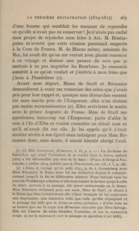 I willingly consented, and I wrote my brother that I was going to Plombières. Before I left, Madame de Staël and Madame Recamier asked to be allowed to call and thank me for my efforts to have their sentence of exile suspended.