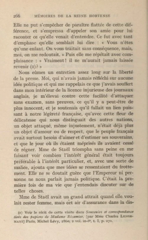 Hortense describes what it’s like when a largely idle group feel they’re losing control over the public’s imagination. Hortense also describes her meeting with Madame de Staël and Madame Recamier, these were 2 highly esteemed women of their era. Hortense seems to be implying she thought they were lovers.