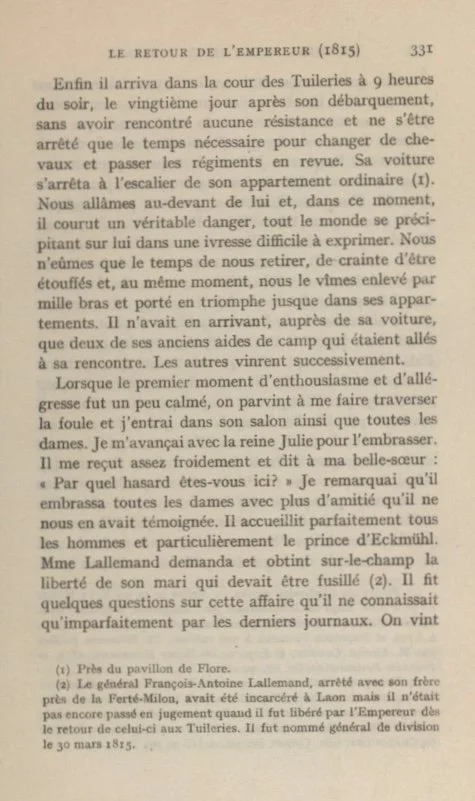 We could scarcely manage to withdraw from the crowd in order to avoid being suffocated ourselves. As we did so we saw him caught up by a thousand arms and carried in triumphantly to his own apartments. When he arrived, there were only two of his former aides-de-camp beside his carriage.