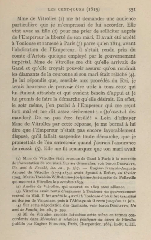 Instead of alarming Madame de Vitrolles by repeating this remark I merely told her that the Emperor was not yet favorably disposed toward her husband, that she must take no further action and I would let her know as soon as I believed I could be more successful. She pointed out to me that her husband had been in charge of publishing the Moniteur [the official newspaper] and that not a derogatory word about me had ever been printed in it.