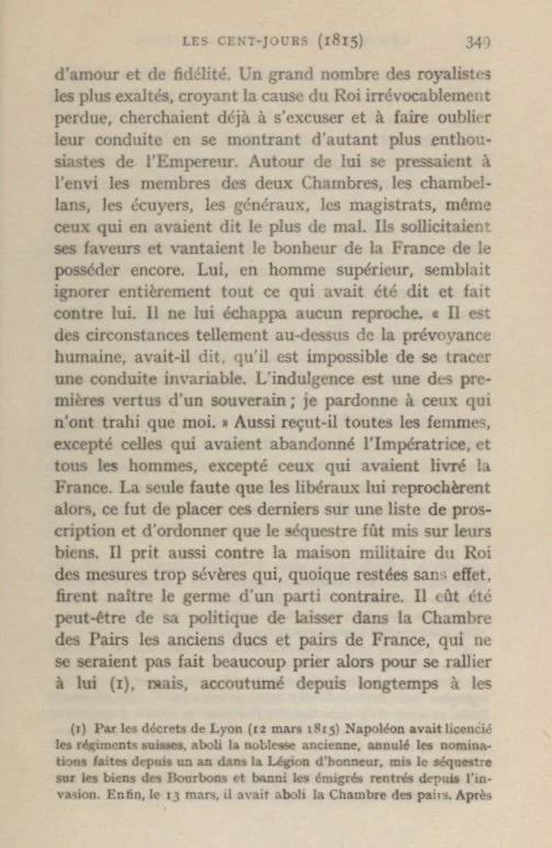 Watching it one was able to surmise how much confidence rulers should place in the affection and loyalty of their subjects. A large number of the most devout royalists, believing the cause of the King to be irretrievably lost, already sought to be forgiven and to explain their previous attitude by expressing their violent admiration for the Emperor.