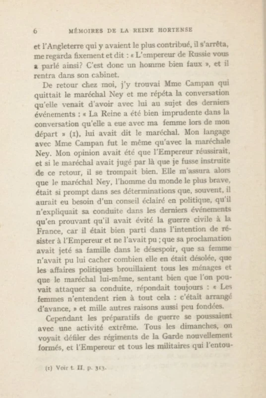 Having said this, he went back to his study. On my return home I found Madame Campan who had just left Marshal Ney. She repeated to me the conversation they had had about recent events.