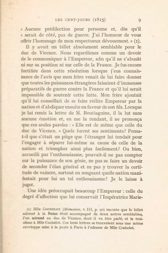 What were his real impressions? Did he imagine that it was some trap the foreign powers had set for him in order to make him separate his personal cause from the national one and thus allow them to triumph more easily? Or did he, on account of the enthusiasm which had greeted his return, feel that his genius could conquer all obstacles, that it was his duty to obey the wishes of the public, and believe he must be victorious, especially when he realized what nation it was that so expressed its faith in his power? I leave it for others to judge.