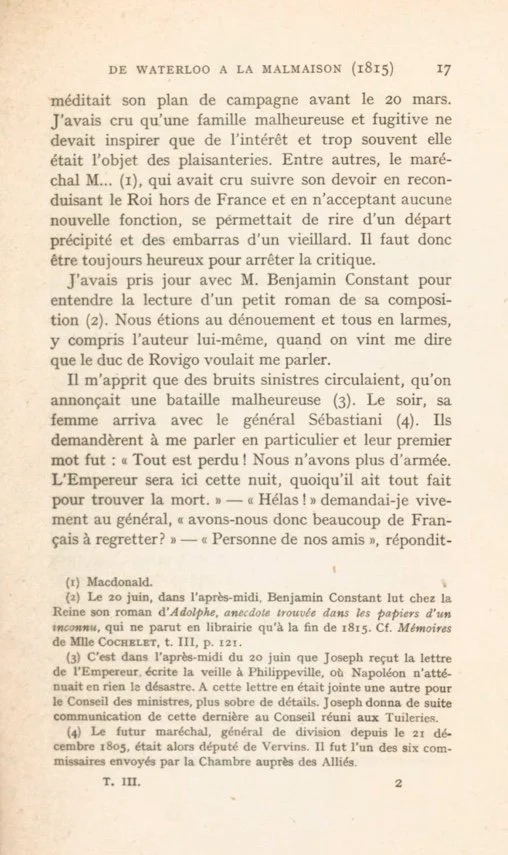 “Ah," I said to General Bertrand, "the Emperor's cause is really lost this time. It was a question of winning a single battle. He is mistaken if he thinks he will meet with a reception similar to that which brought him back to Paris. The French are so changeable.