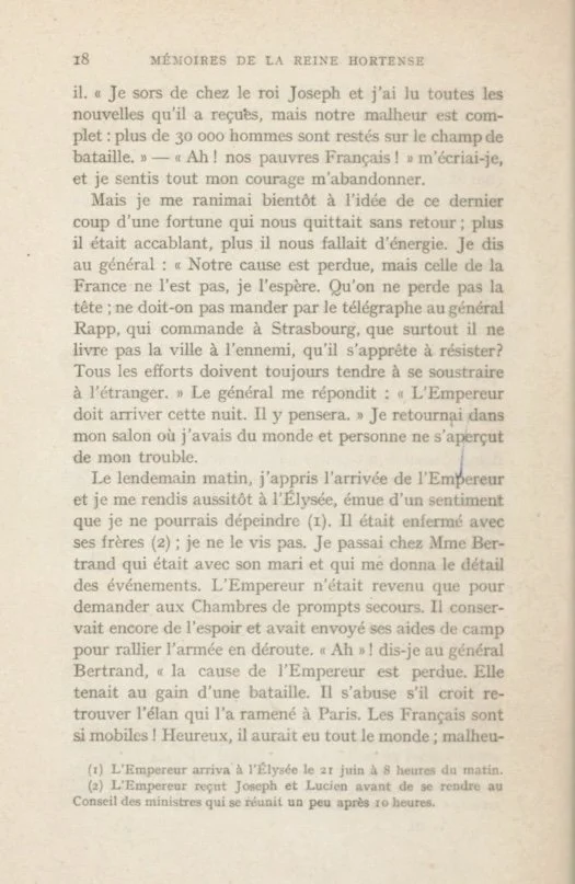 I did not see him. I went to see Madame Bertrand. She was with her husband and gave me details of what had taken place. The Emperor had only returned in order to ask the Senate and Chamber of Deputies for more support. He still hoped all was not over and had dispatched his aides-de-camp to rally the scattered troops.