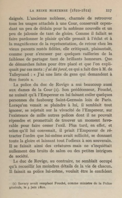 How many efforts to secure a position people explained by saying, "It was forced upon me." As Monsieur de Talleyrand put it: "I have a list of people who want to be forced." The police system directed by the Duc de Rovigo also did a great deal of harm to the court ladies. His predecessor Fouché only harmed the Emperor when he obliged the latter to exile certain persons of the Faubourg Saint-Germain from Paris.