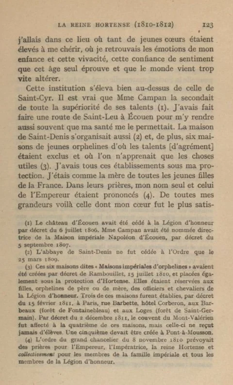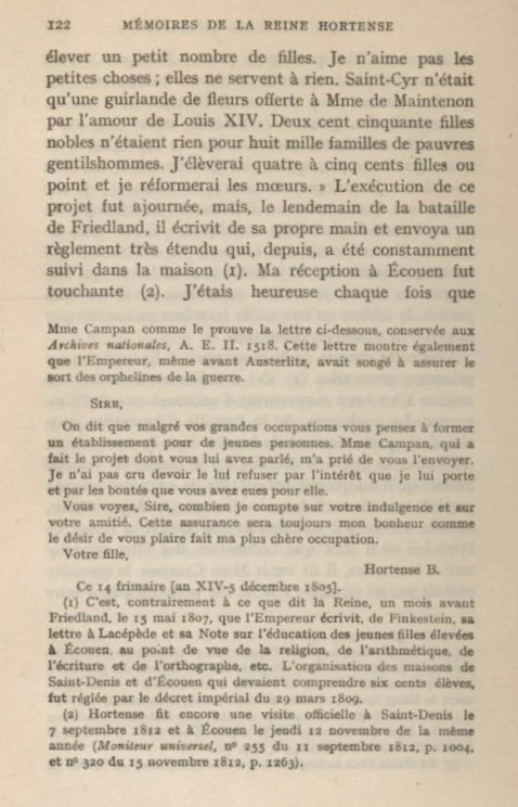 The establishment was far superior to Saint-Cyr. It is true that Madame Campan devoted all her remarkable talents to its success. I had a road made connecting Saint-Leu and Ecouen in order to go there as often as my health permitted. The school at Saint Denis was also organized, as well as six other schools for orphan girls where no mere social accomplishments were taught, but where the pupils learned things only of practical value.