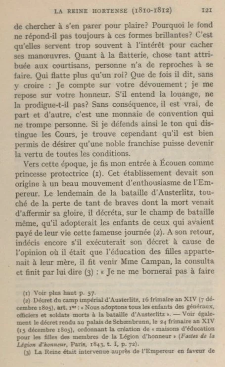 About this time, I made my appearance at Ecouen as princesse protectrice of the school. The institution was the result of a fine moment of enthusiasm on the part of the Emperor. The day after the Battle of Austerlitz, touched by the loss of so many brave men whose death had added to his own glory, he decreed while still on the field of battle that he was prepared to adopt the children of all those who had lost their lives on that famous occasion.