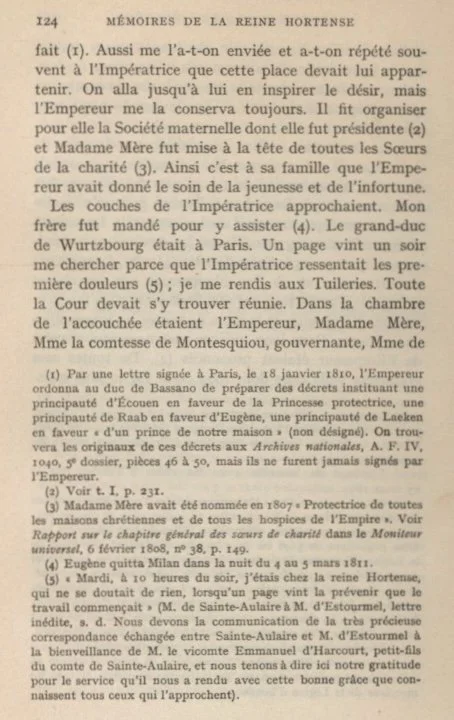 In the footnotes of the French edition below, a letter from Hortense to Napoleon is shown which closes with her telling him that the desire to please him is her most precious occupation.