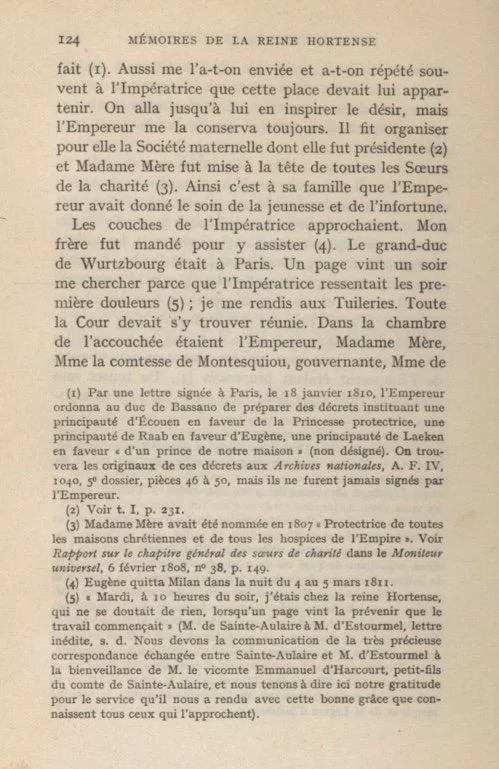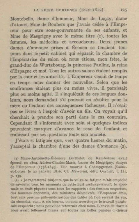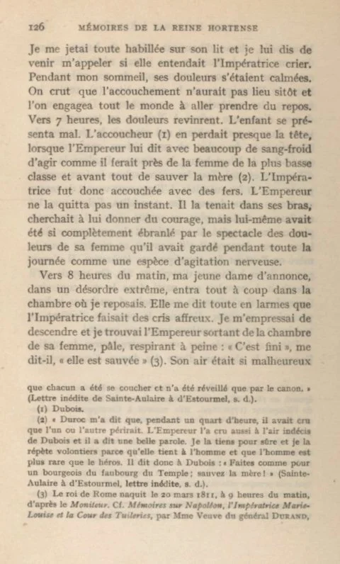 Hortense leaves out what many other memoirists did not of this birth scene. Others reported that Marie Louise was screaming that Napoleon was going to sacrifice her and that Napoleon kept trying to calm her out of this fixed belief of hers.