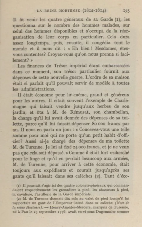 One day the Emperor spoke to us about this and said "Can you imagine such a sum being spent on me who only wear an officer's undress uniform? That was why I told Monsieur de Turenne to look after my wardrobe expenses. I limited them to 24,000 francs per year and I do not in-tend to exceed this sum."