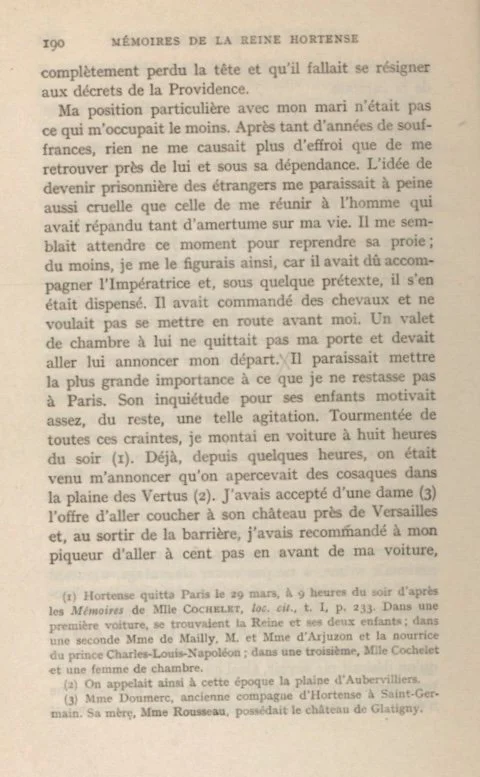 I arrived without any trouble at Glatigny, worn out by so many varied emotions. I was undecided whether to proceed on to Rambouillet and rejoin the Empress Marie Louise or go to my mother at Navarre where she doubtless had arrived.