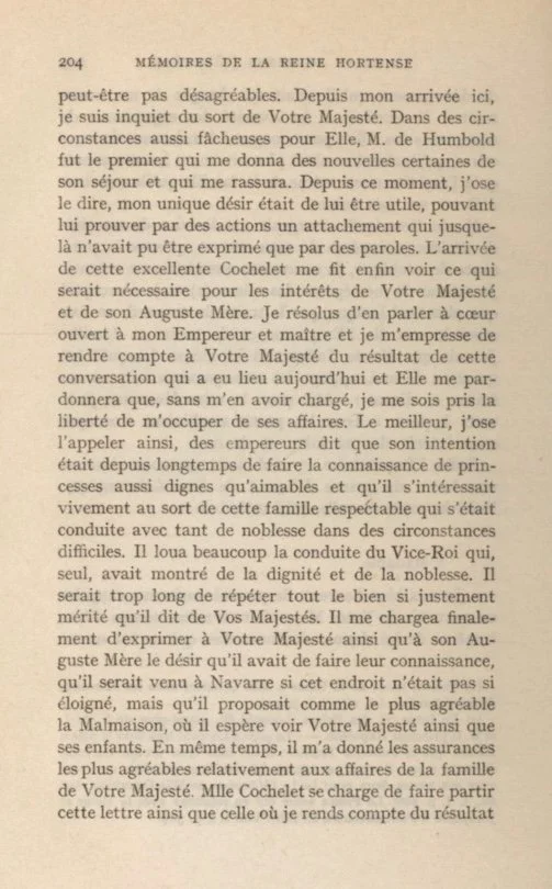 He hoped to see your Majesty there and also her children. At the same time, he conveyed to me the most reassuring news regarding the business affairs of your Majesty's family. Mademoiselle Cochelet has undertaken to convey this letter to her as well as one in which I inform her Majesty the Empress what I have been able to do on her behalf. May I request your Majesty to be kind enough to inform me when she expects to arrive at Malmaison, and when her August Mother will also be there, in order that I may announce the fact to the Emperor in advance.