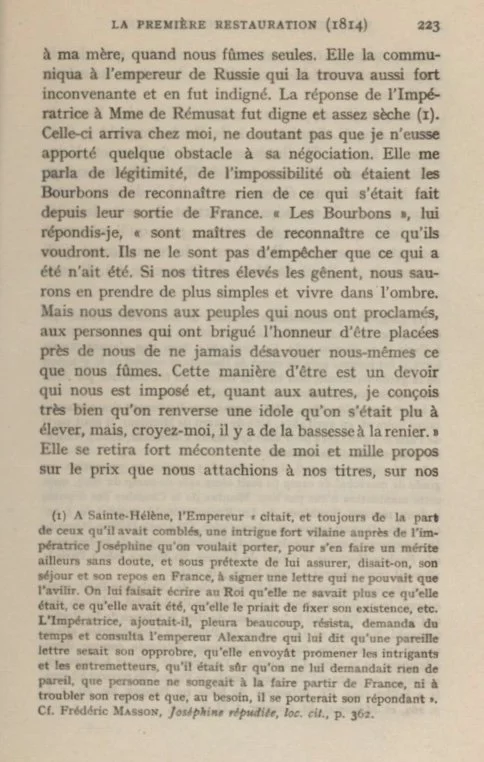 The Empress's reply to Madame de Remusat was dignified and rather disdainful. Madame de Remusat came to see me, as she was convinced that I had placed obstacles in the way of the success of her negotiations. She talked about the legitimacy of the dynasty and pointed out how impossible it was for the Bourbons to recognize anything that had taken place since their departure from France and so on.