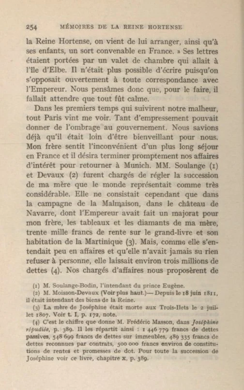 Yet it consisted only of her country place at Malmaison, the Château of Navarre, which the Emperor had entailed for my brother, her pictures and diamonds, an income of thirty thousand francs in government securities, and her property in Martinique. But as she never understood much about money matters and as she never knew how to say no to anyone who asked her for something, she left about three million francs worth of debts.