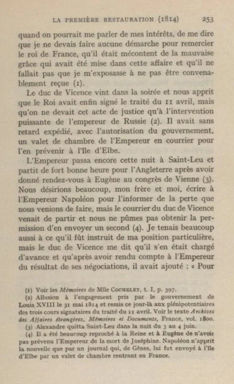 I was most anxious also to let him know how my personal affairs had been arranged, but the Duc de Vicence told me he had already done this, and that after having described the negotiations to the Emperor he had added, "As for Queen Hortense, suitable provisions for her and her children are being arranged in France."
